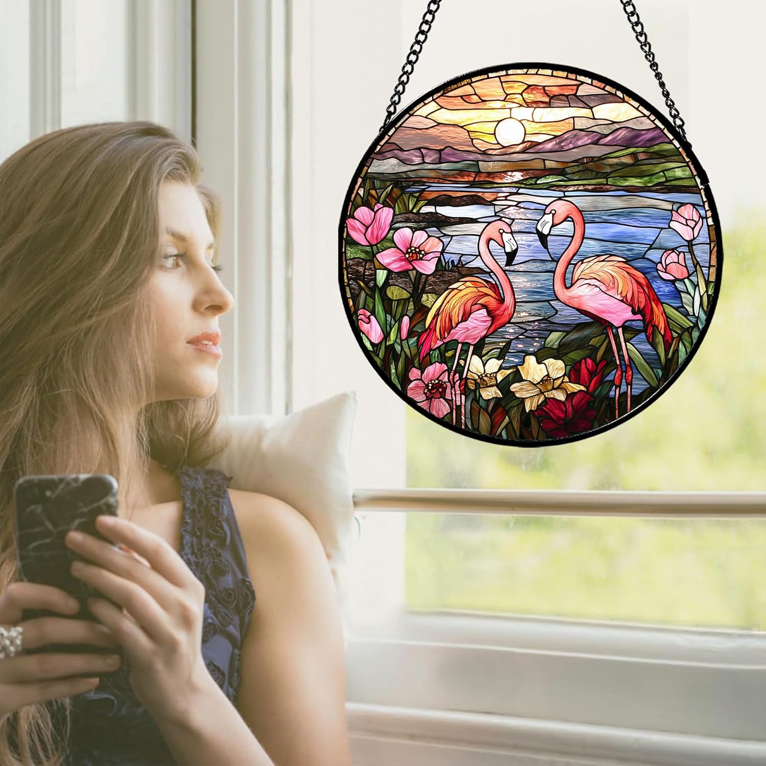 Stained Glass Window Hanging - Flamingo Wildflowers Landscape Suncatcher for Door Terrace Garden Home Decor Sunset Lake Sun Catcher Birthday Gifts for Lovers Women Men Dad Mom Nana 11.8 in