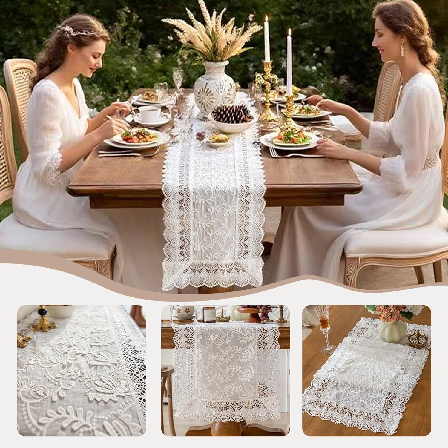- Telegant Design: Beautiful white lace table runner featuring intricate floral embroidery and scalloped edges, perfect for adding a french romantic touch to any table setting. The simple design provides more possibility to match with the surrounding decoration, whether itβs modern or vintage.