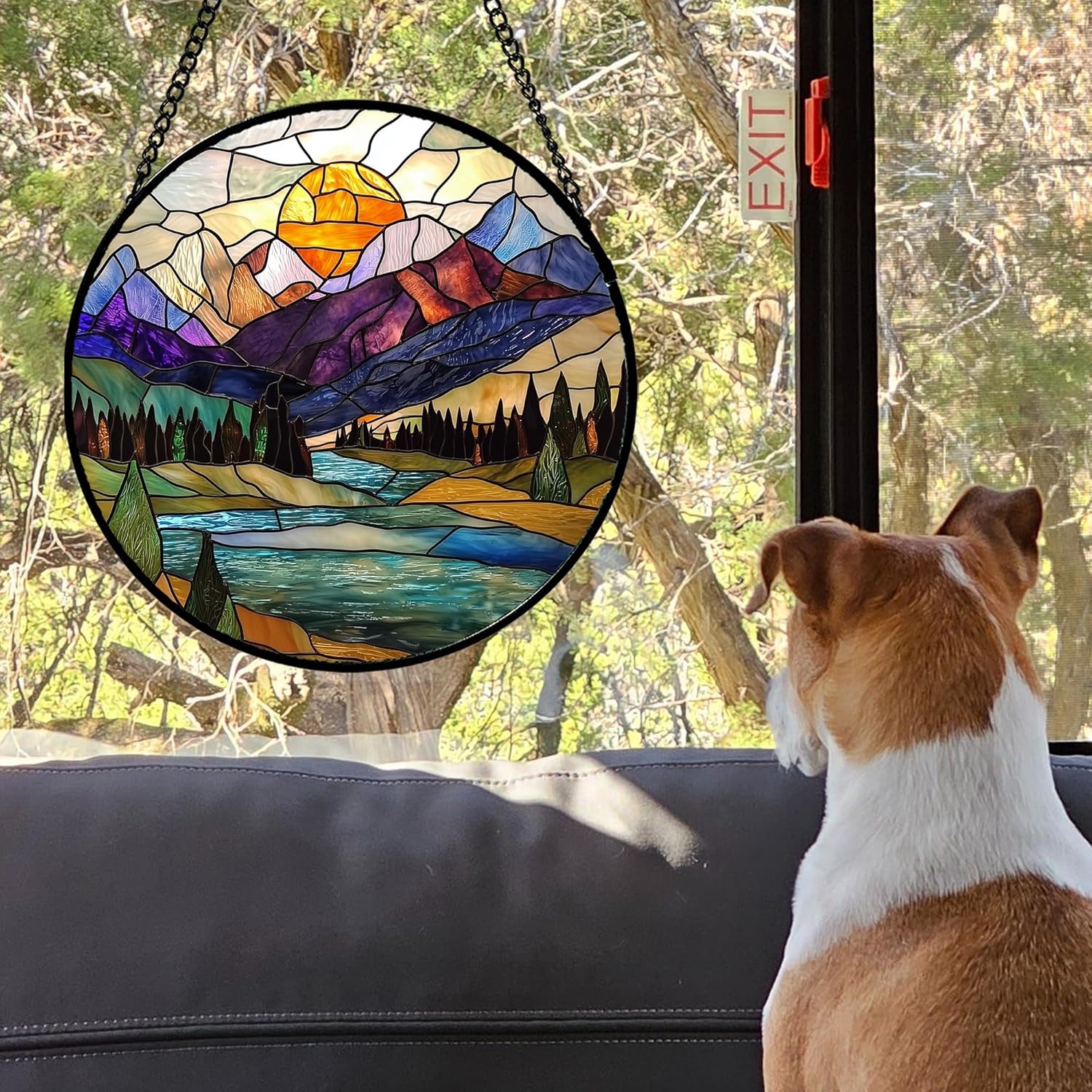 Stained Glass Window Hanging, Blue Lake Golden Sun Abstract Mountains Landscape Suncatcher for Doors Window Home Sun Catchers Decor Mother's Day Birthday Gifts for Women Men Mom 6.3 in