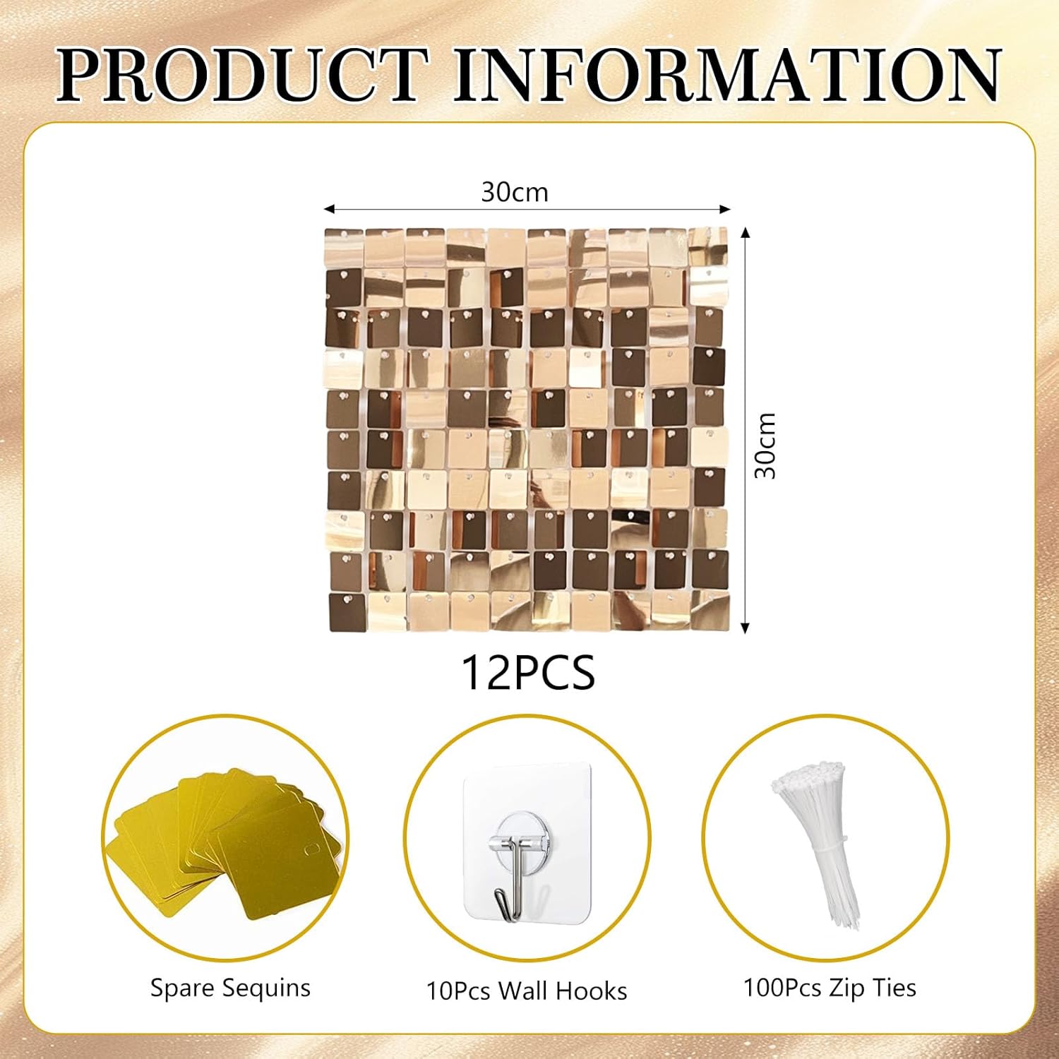 - 【Package Includes】Each box includes 12 champagne gold wall panels (12"x 12" each). We provide enough zip ties (100 pcs), a pack of spare sequins, and wall hooks (10 pcs) to support the weight of the wind panel, as well as an installation manual. 12pcs can cover 3x4ft place. More boxs will cover a larger area and have a fuller look.