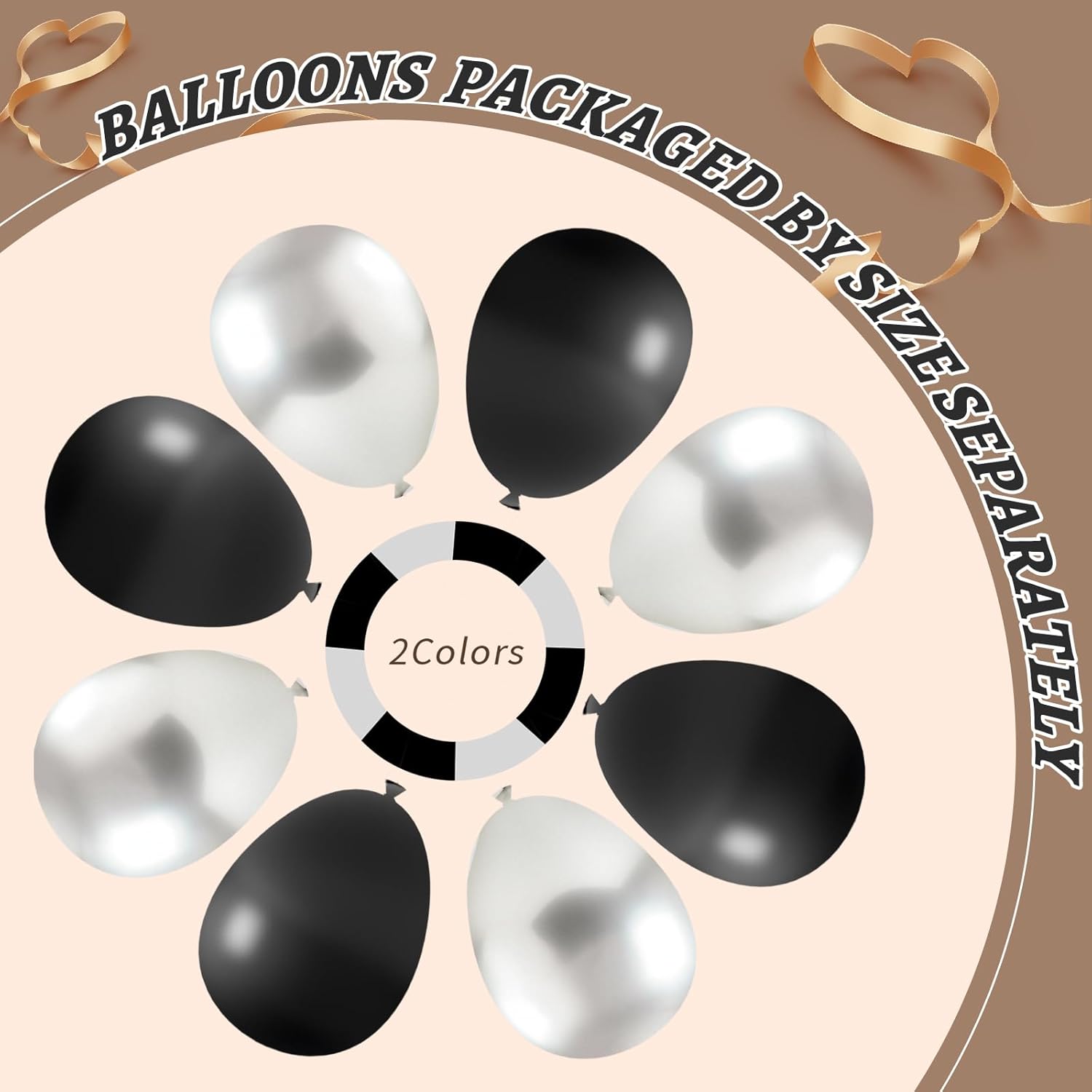 - Package List :Black and Silver Balloons Garland Arch Kit includes 18" Black /metallic Silver balloons(12 pcs), 12" Black /metallic Silver balloons(100 pcs), 10"Black /metallic Silver balloons (100 pcs), 5" Black /metallic Silver balloons(100pcs),glue dotsx200, ribbonx2, decorative stripx2. plenty in quantity, Perfect for balloon arch kit and black and silver birthday decorations