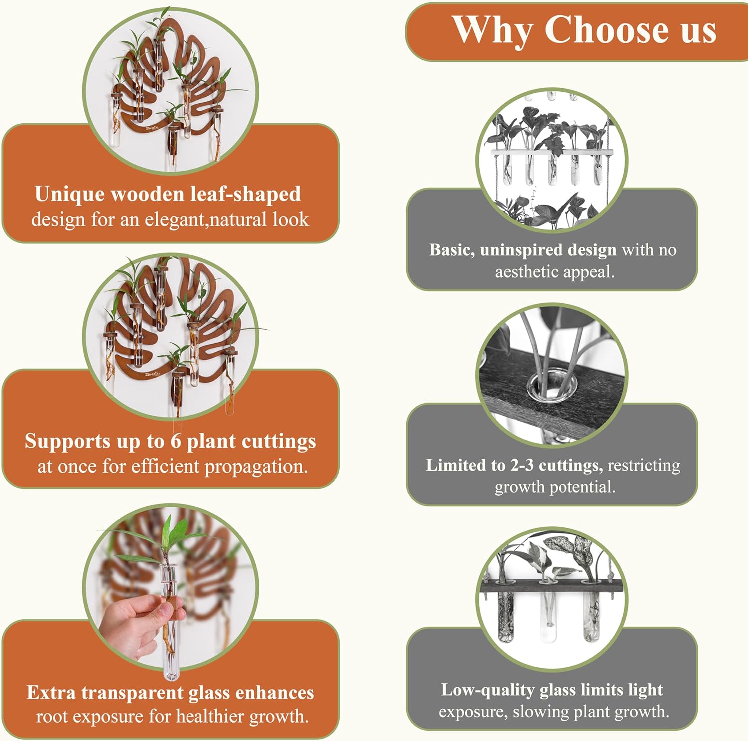 - Enhanced Growth β Grow up to 6 cuttings at once with our hanging wall planter. It provides better light exposure for root development, designed with extra-transparent propagation tubes, promoting healthier growth for your plants. The spacious test tubes allow plant cuttings to thrive, making propagation easier and more efficient.