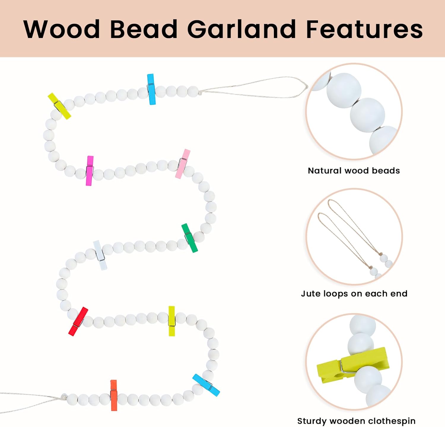 - The total length of wood bead garland is 54.8". Each garland includes 10 clips, you can give your custom wall art a makeover any time you want by simply removing or adding photos. Easily add some special to your beautiful bohemian home decor, sweet farmhouse decor, or modern minimalist style