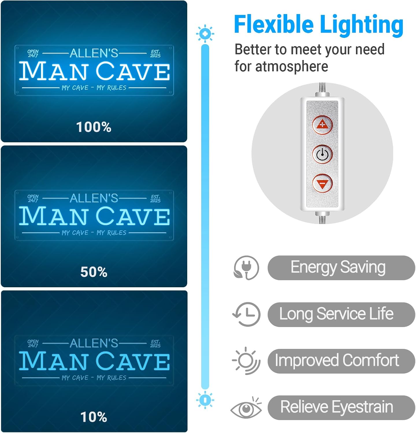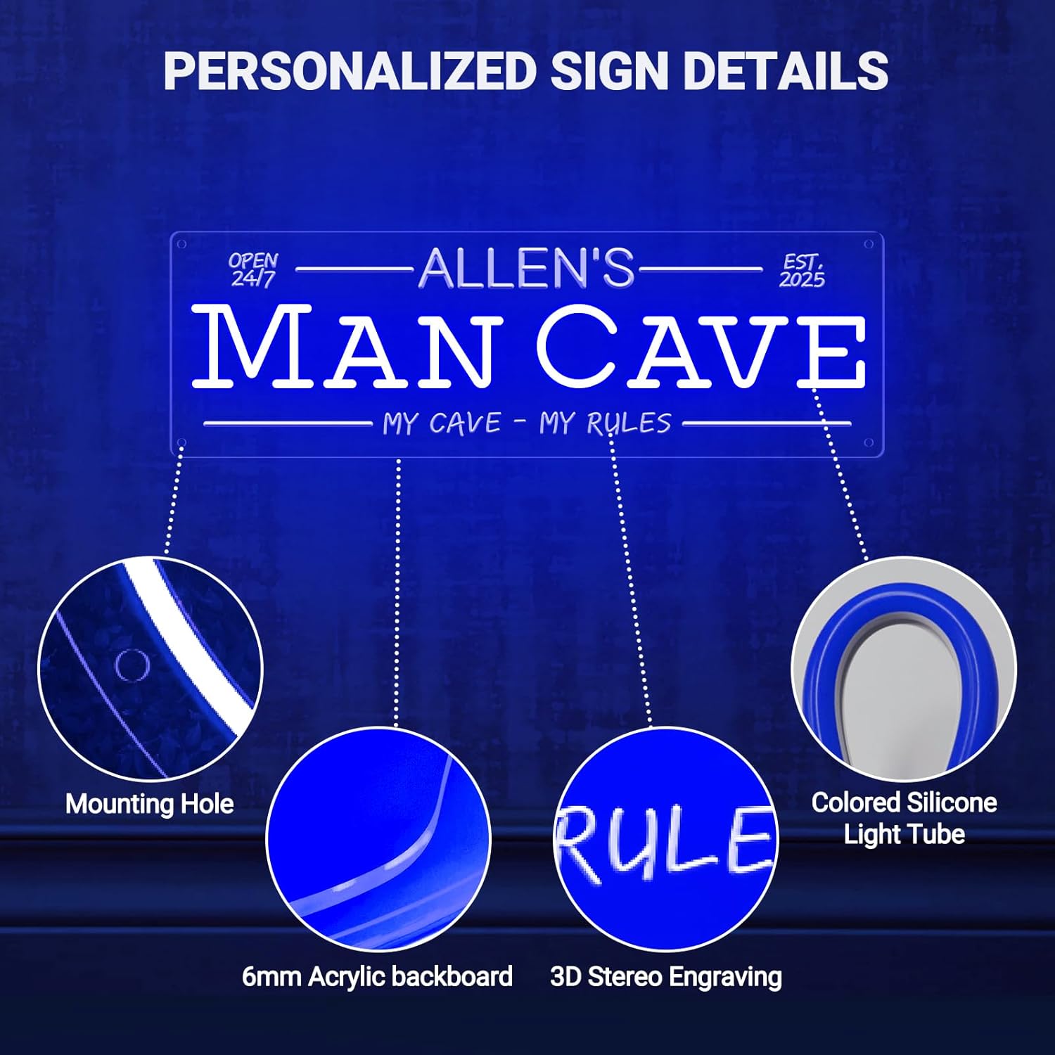 - 🌟【3D Engraving Process】Our customizable man cave neon signs feature a upgraded 3D engraving process, where custom text and graphics are etched onto a clear acrylic board. The stereo carvings are colorless and illuminated by vibrant colored LED neon strips that bring out the best 3D lighting, adding depth and brightness to turn any wall into a personalized artwork.