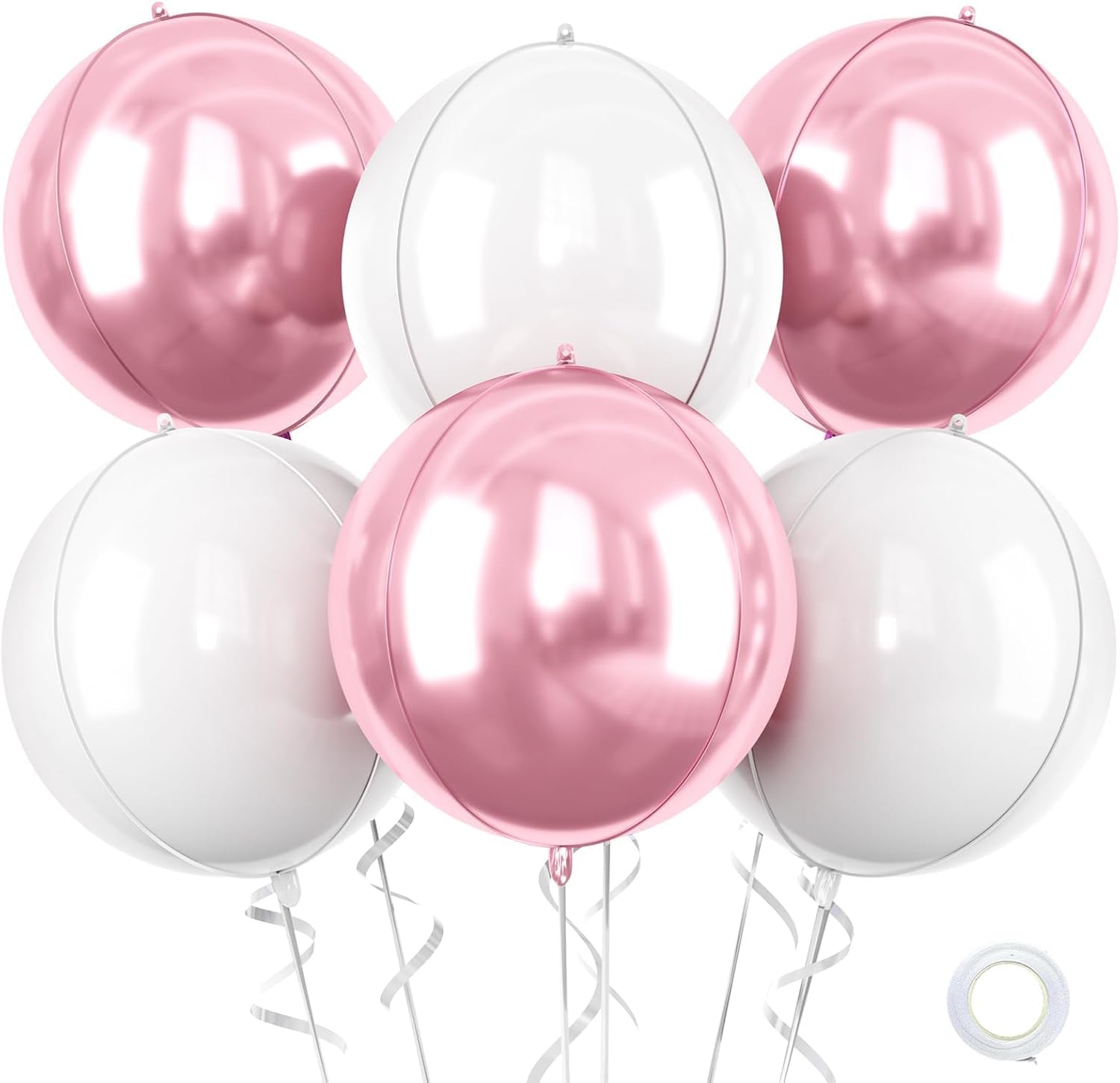 Pink White Giant 4D Foil Balloons, 6 Pcs Large Metallic Pink and White Round Balloons, 22 Inch Big Round Foil Balloon for Wedding Prom Birthday Party Baby Shower Decorations