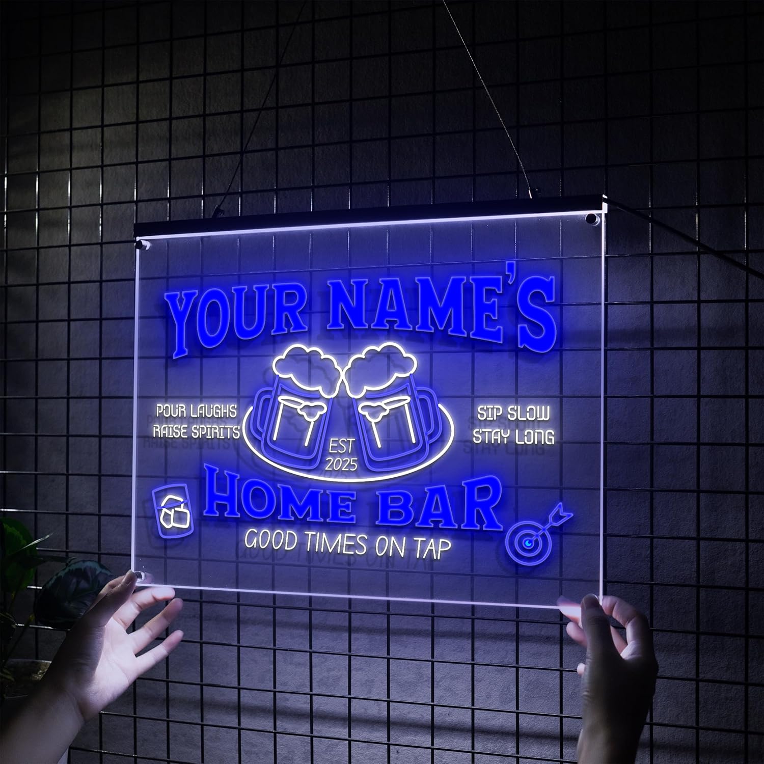 - Wide range of customizable bar signs for every space and mood. Choose from 1 or 2 color personalized neon bar signs, perfect for any custom pub sign or personalized beer sign. Available in 6 LED colors—blue, green, yellow, red, pink, and white. Each sign supports up to 2 colors, letting you personalize your home bar with the perfect mix.