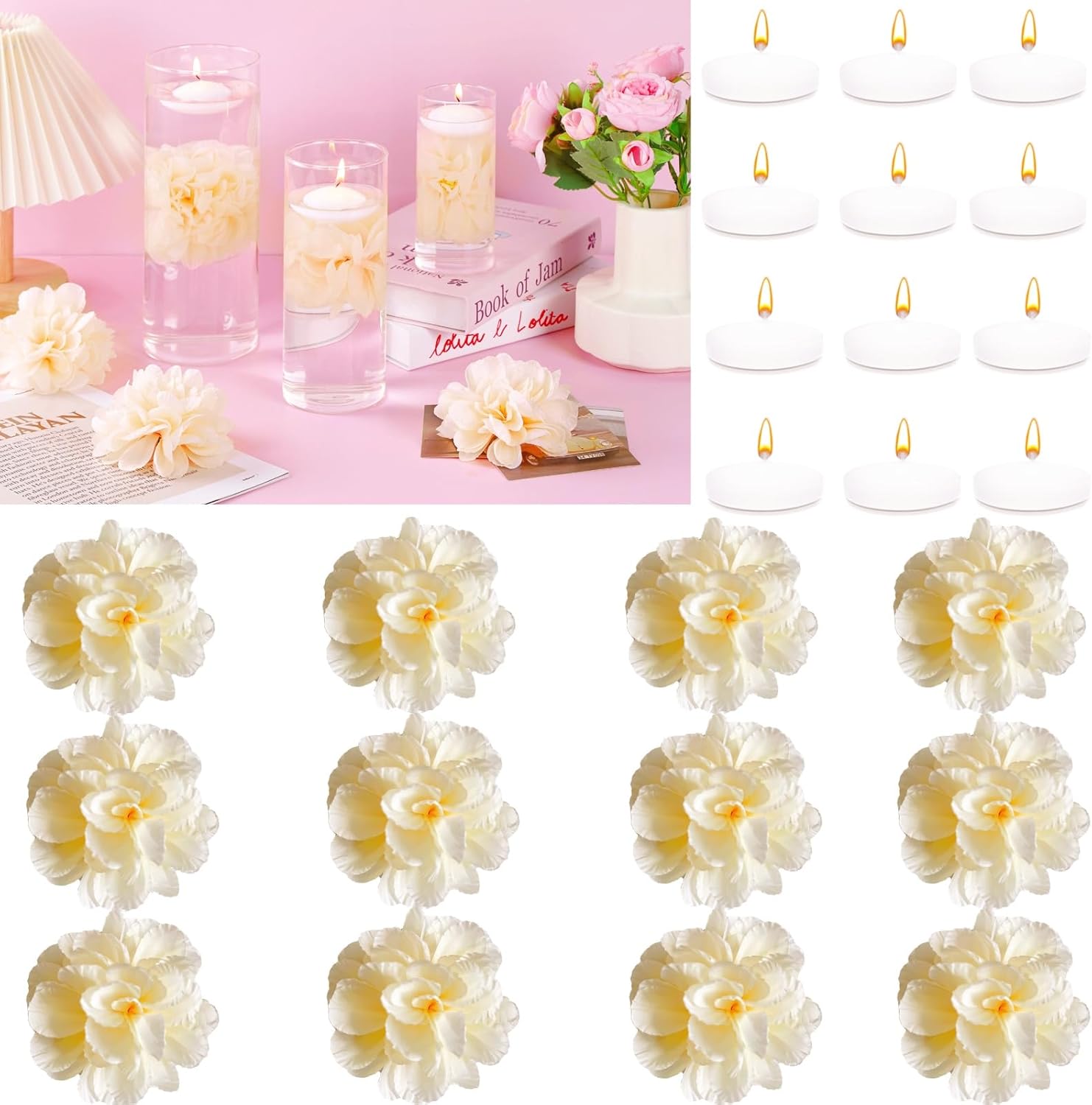 - 24-PCS MATCHED FLOATING SET: This combo include 12 pcs artificial flower and 12 pcs floating candles. Champagne flowers’ soft texture and vibrant colors complement the candles’ warm glow, saving you the trouble of matching separate items