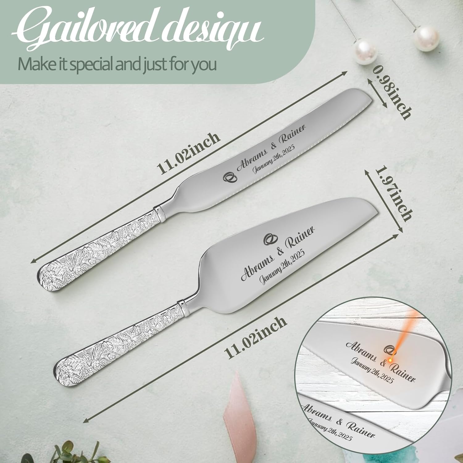- Personalized Wedding Cake Cutting Set : Personalize the cake knife and server with names, dates,transforming them into a one-of-a-kind keepsake. The precision engraving turning your cake-cutting ceremony into a moment to cherish for a lifetime