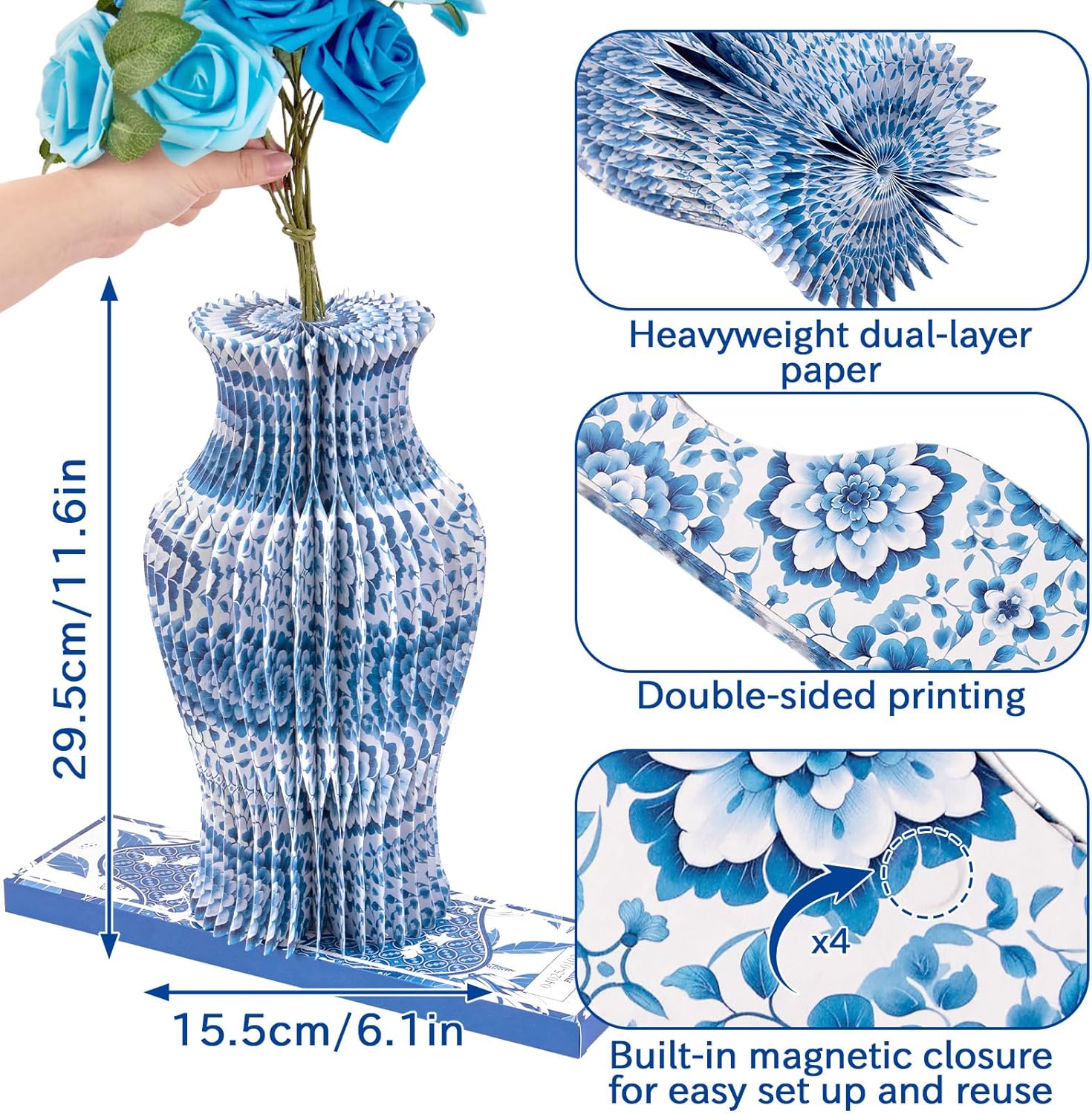 Blue and White Paper Honeycomb Vase, 11.6 Inch Foldable Decorative Vase with Magnetic Closure, Chinoiserie Décor Vase, Reusable Table Centerpiece for Home Decor, Party Decorations