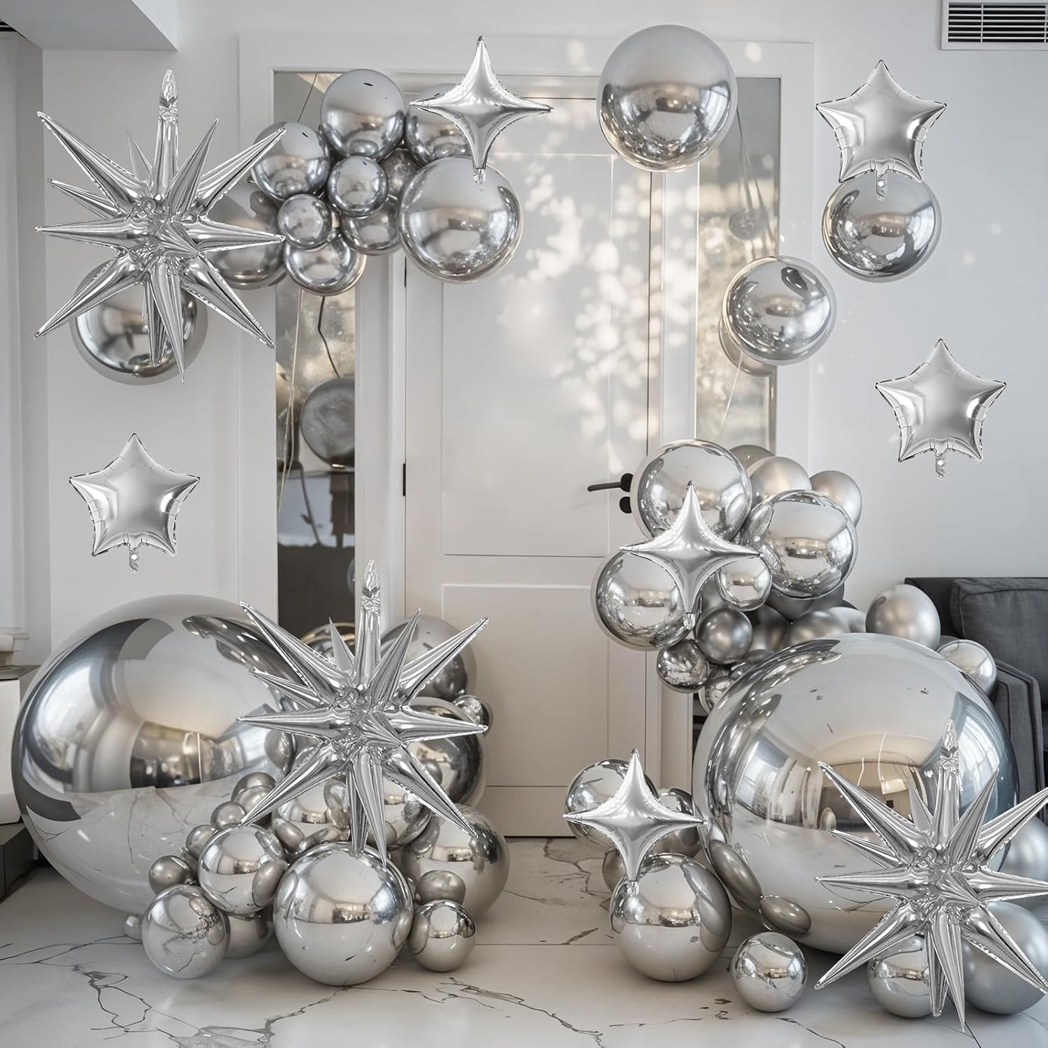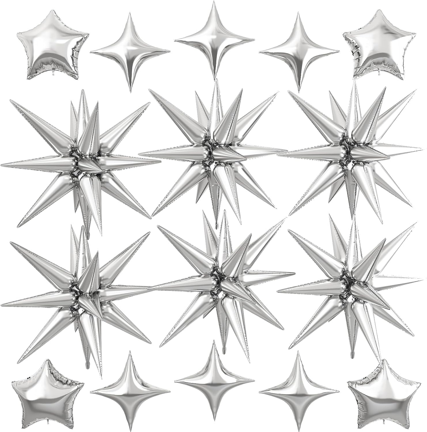 - Package: This set includes 6pcs 22inch silver explosion star foil balloons, 4pcs 10inch silver star foil balloons, 6pcs 10inch silver four angle star balloons, and a ribbon. Perfect for creating a dazzling party atmosphere.