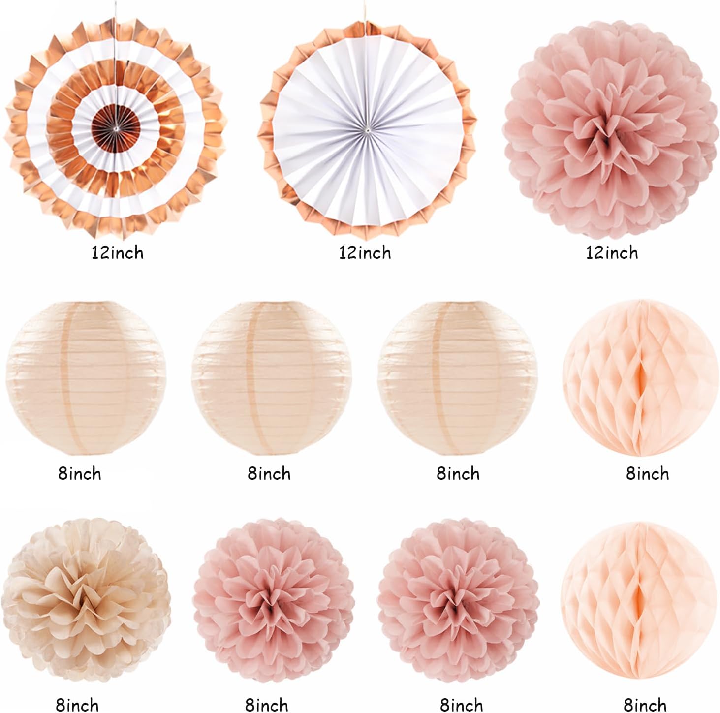 - 【Package Content】Blush pink rose gold fall bridal shower party decorations contains: 1 pcs bride to be banner, 1 pcs circle dots paper banner, 3 pcs hanging paper lanterns, 4 pcs tissue paper pom poms, 2 pcs honeycomb balls, 4 pcs paper fans, 6 paper swirls, total 21 pcs in 8 12 16 inch and blush pink rose gold peach color.