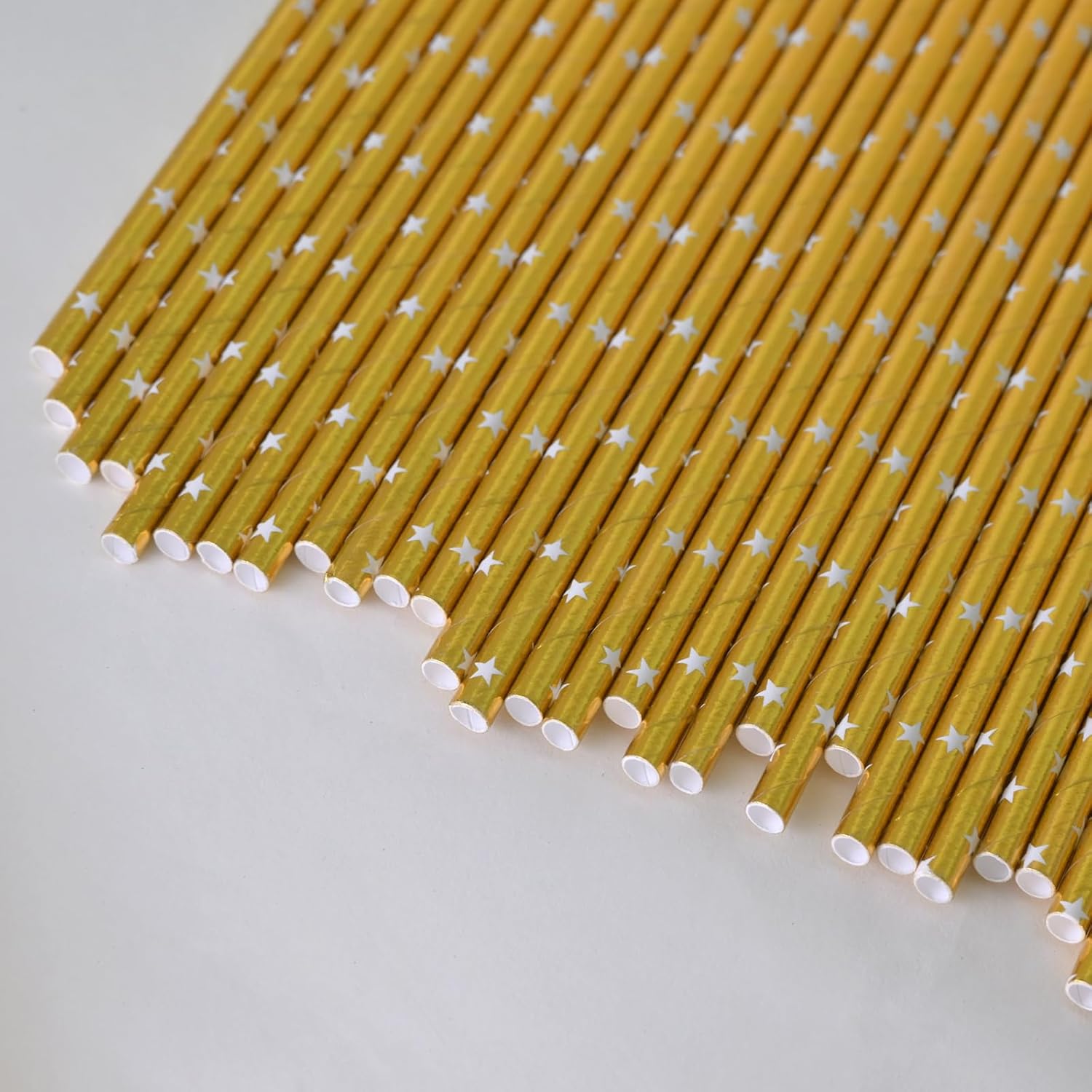 Gold Drinking Straws - Disposable White Star Print Foil Gold Biodegradable Paper Straws, 7.75 Inch, 100 Pack - Party Supplies