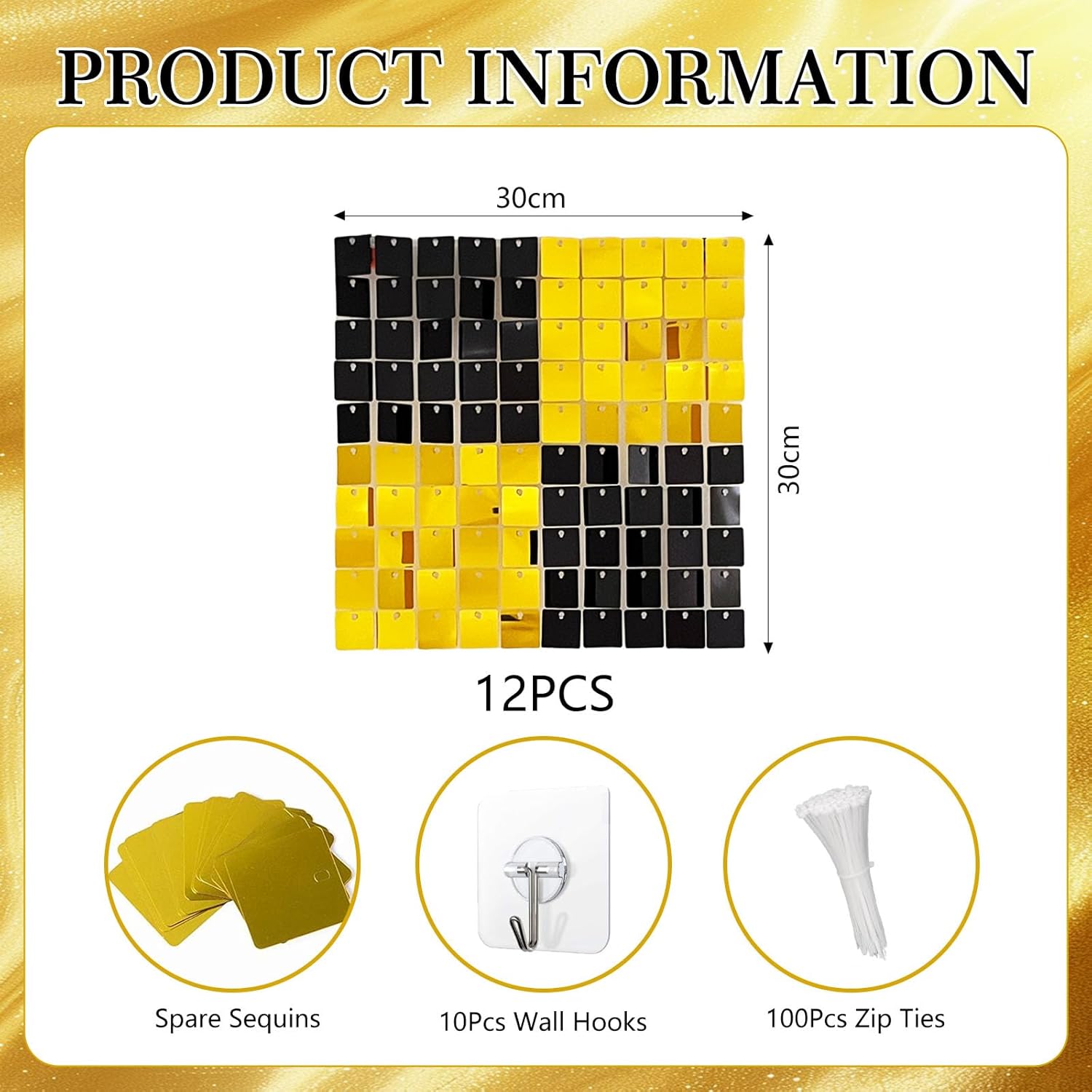 12PCS Black Gold Shimmer Wall Backdrop, Square Sequin Photo Backdrops Panel, Glitter Wall Background for Birthdays, Weddings, Christmas, Engagements, New Years Party Decor (3FTx4FT)