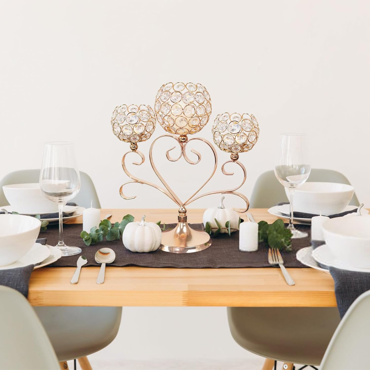 2 Pcs 3-Arm Heart Tea Light Candle Holder - Crystal & Metal Wedding Centerpiece Decor, Sparkling Table Decor for Anniversaries/Romantic Tabletop Home/Dinner Party/Events (2, Gold)