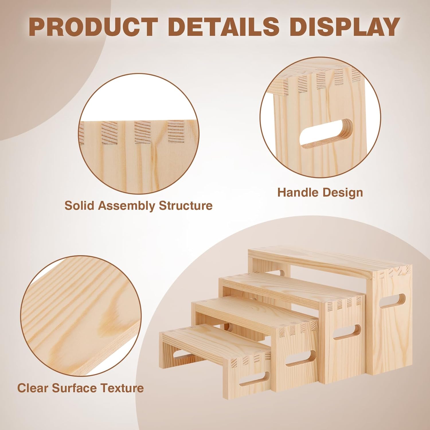 - High-Quality Materials: This set of wooden display risers is made of high-quality natural solid wood, which is durable and well-made. The natural wood texture makes the collection in the display stand out and suitable for any decorative furniture in the home