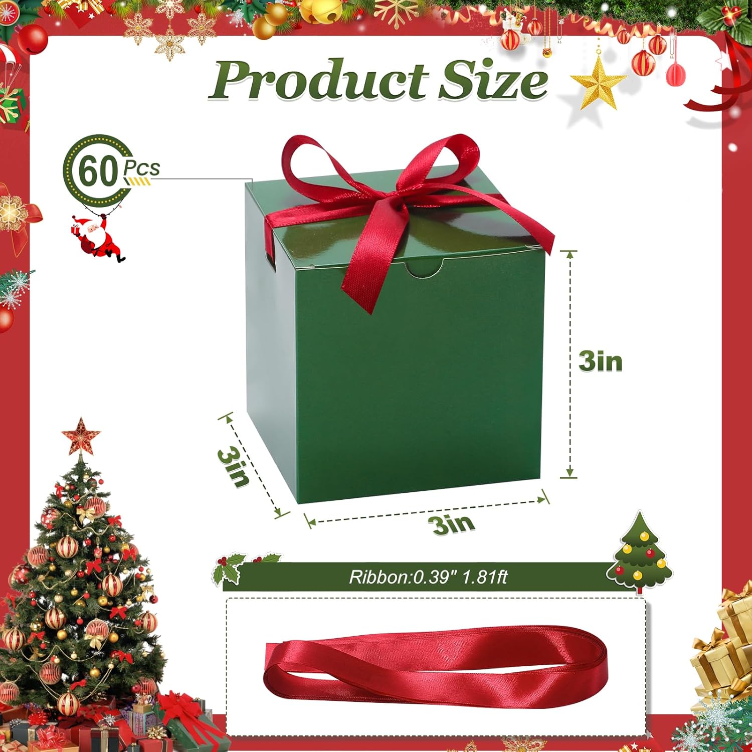 DOYIDE 60 Pcs Small Gift Boxes, 3x3x3 inches Kraft Paper Gift Box with Ribbons, Green Candy Boxes for Christmas Wedding Favors Baby Shower Bridal Shower Birthday Party