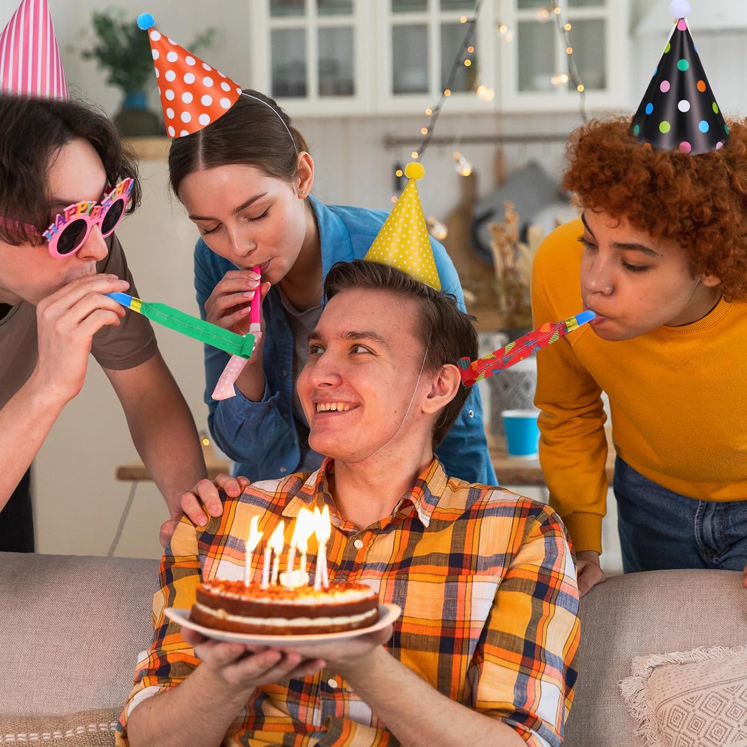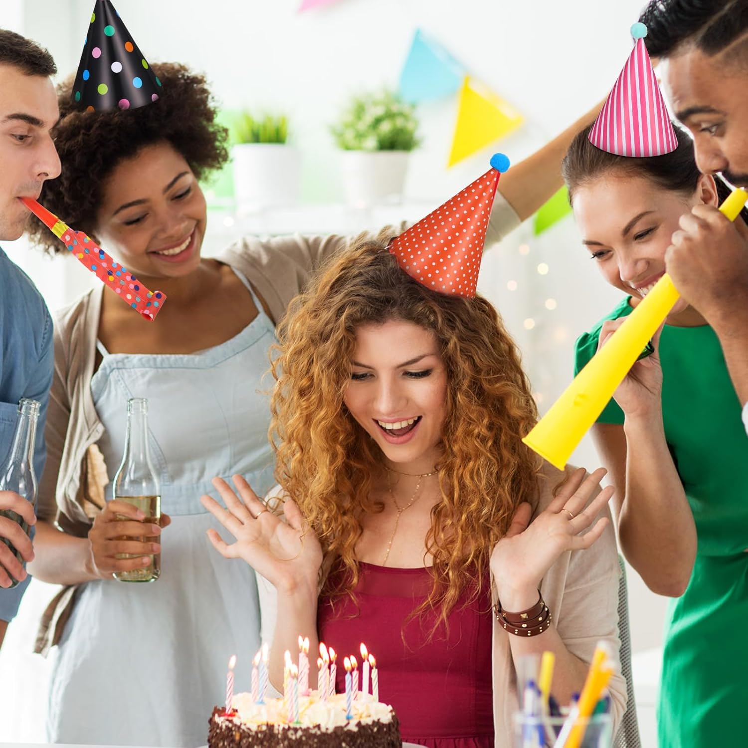 - 【Colorful Cone Hats Enhance Festive Atmosphere】:The cone-shaped birthday hats feature Muti-Color designs headwear with paper-plastic composite materials and cute dragon tassel whistles decorations. make your party full of more fun.
