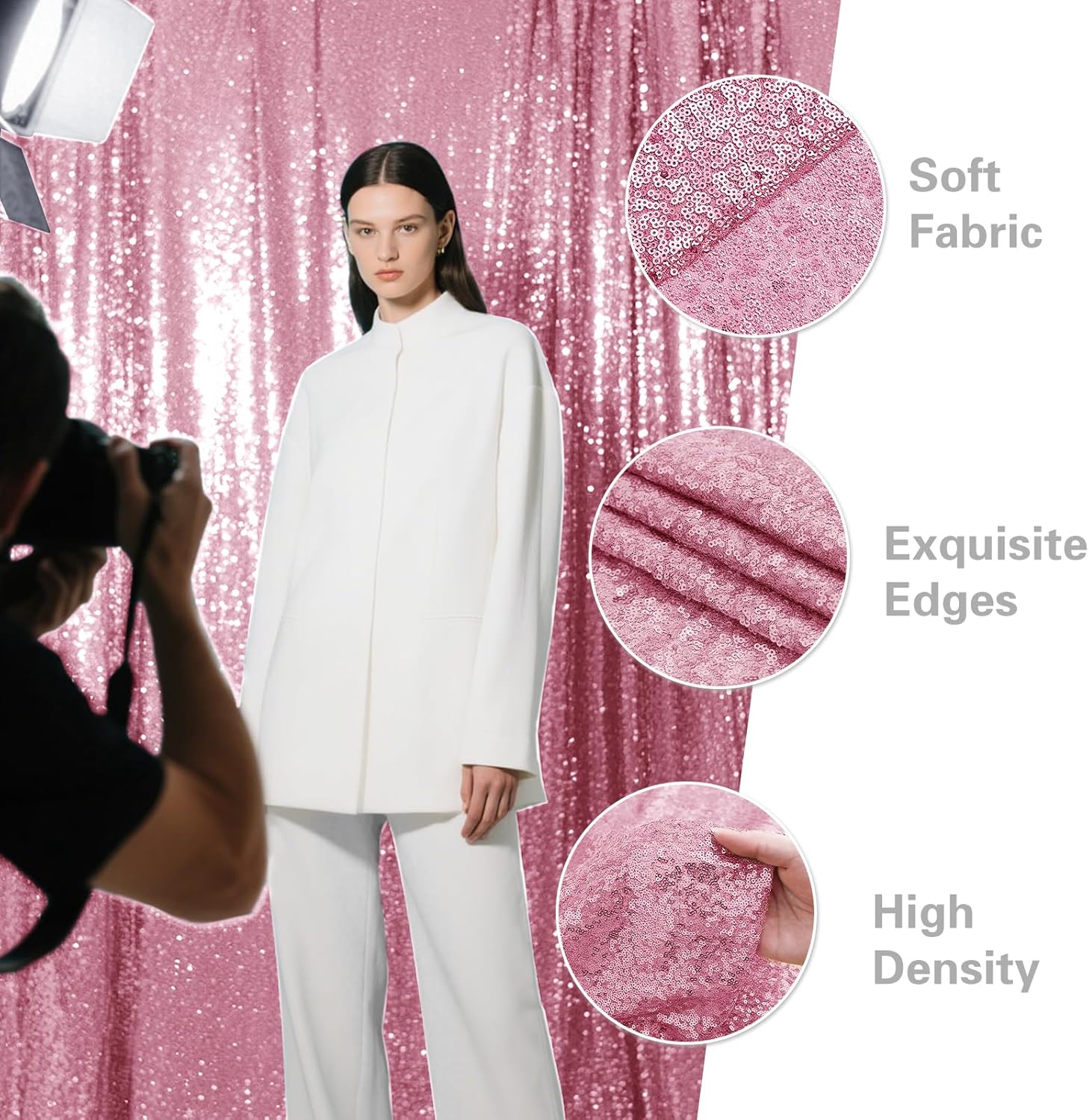 - Durable Material: The sequin backdrop is made of 3MM round density sequins with mesh fabric backing. All sides are well folded and sequins are not easy to drop which can be reused.