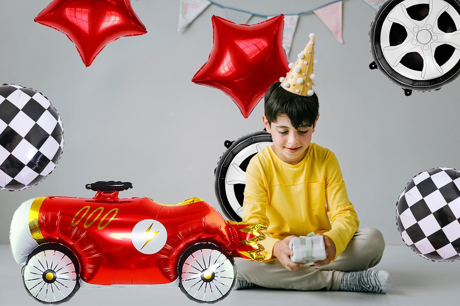 - 【 Appearance and Design 】 These aluminum foil balloons are designed in the shape of retro racing cars, wheels and tires, as well as black and white squares. The vivid and realistic appearance of the racing cars will attract the attention and interest of guests, bringing them a pleasant mood. You will receive 1 colorful racing balloon +2 wheel balloons +2 black and white checkered balloons +2 red star-shaped balloons (uninflated) + 1 ribbon roll.