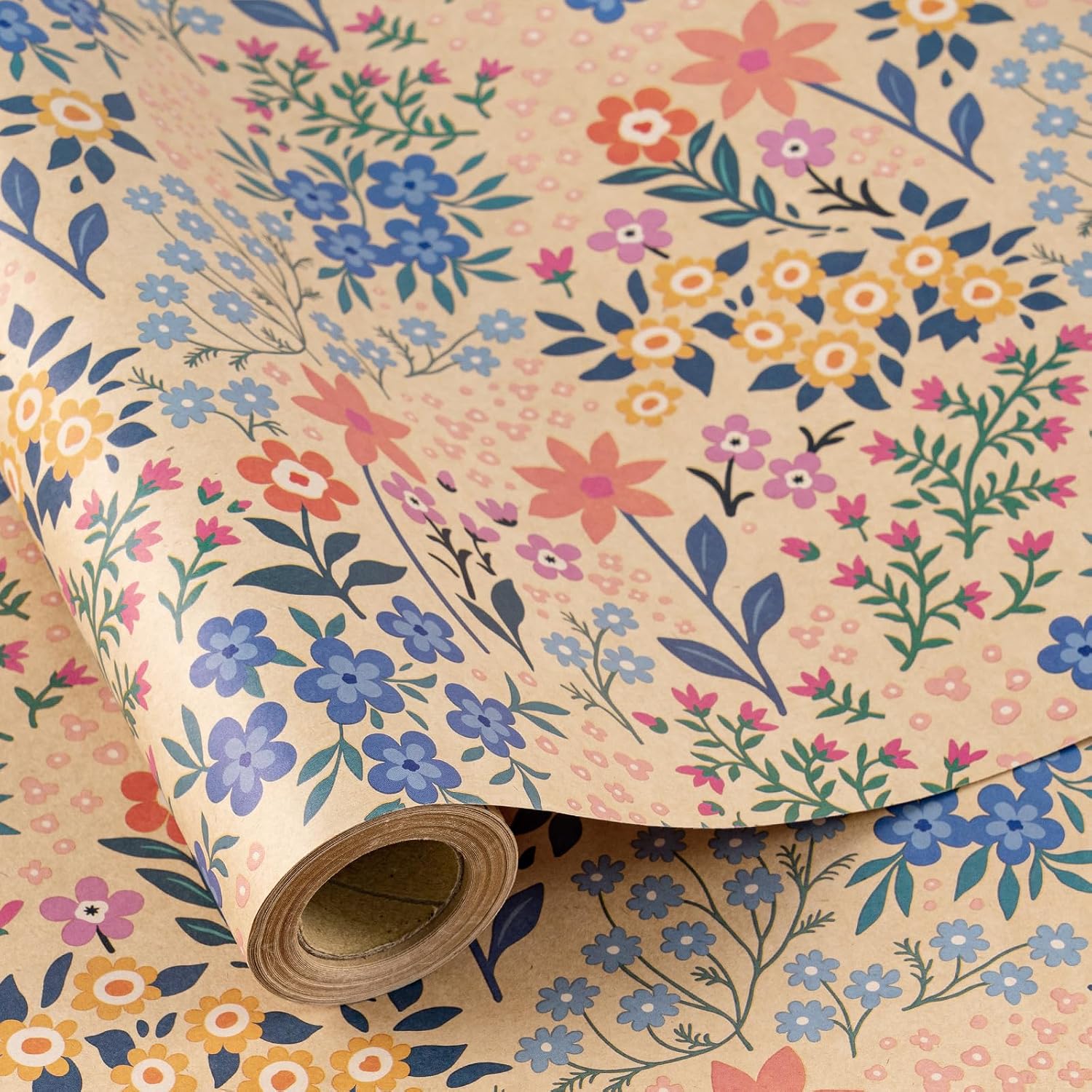 RUSPEPA Kraft Floral Wrapping Paper Roll for Girls Women, Mini Roll, Garden Flower Design, Wildflower Kraft Gift Wrap for Birthday, Spring, Summer, Mother's Day, Bridal Shower, 17 Inches x 9.8 Feet