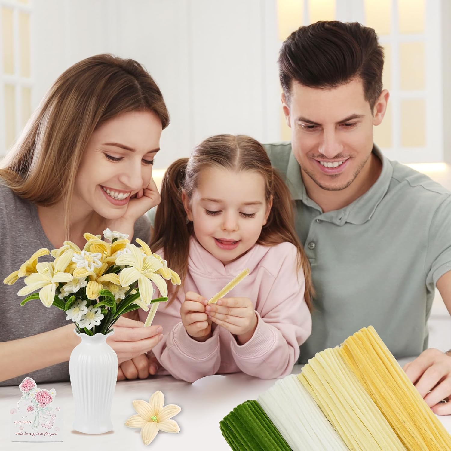 - 【Pipe cleaner crafts kit】The product includes all crafting accessories for flower bouquets: 400pcs pipe cleaners,20pcs floral Wires, 2pcs gardening tapes,2pcs hot glue Sticks,1pc greeting card,3pcs bouquet papers, 1 bag stamen ,1pc Ribbon&1pc easy instruction.