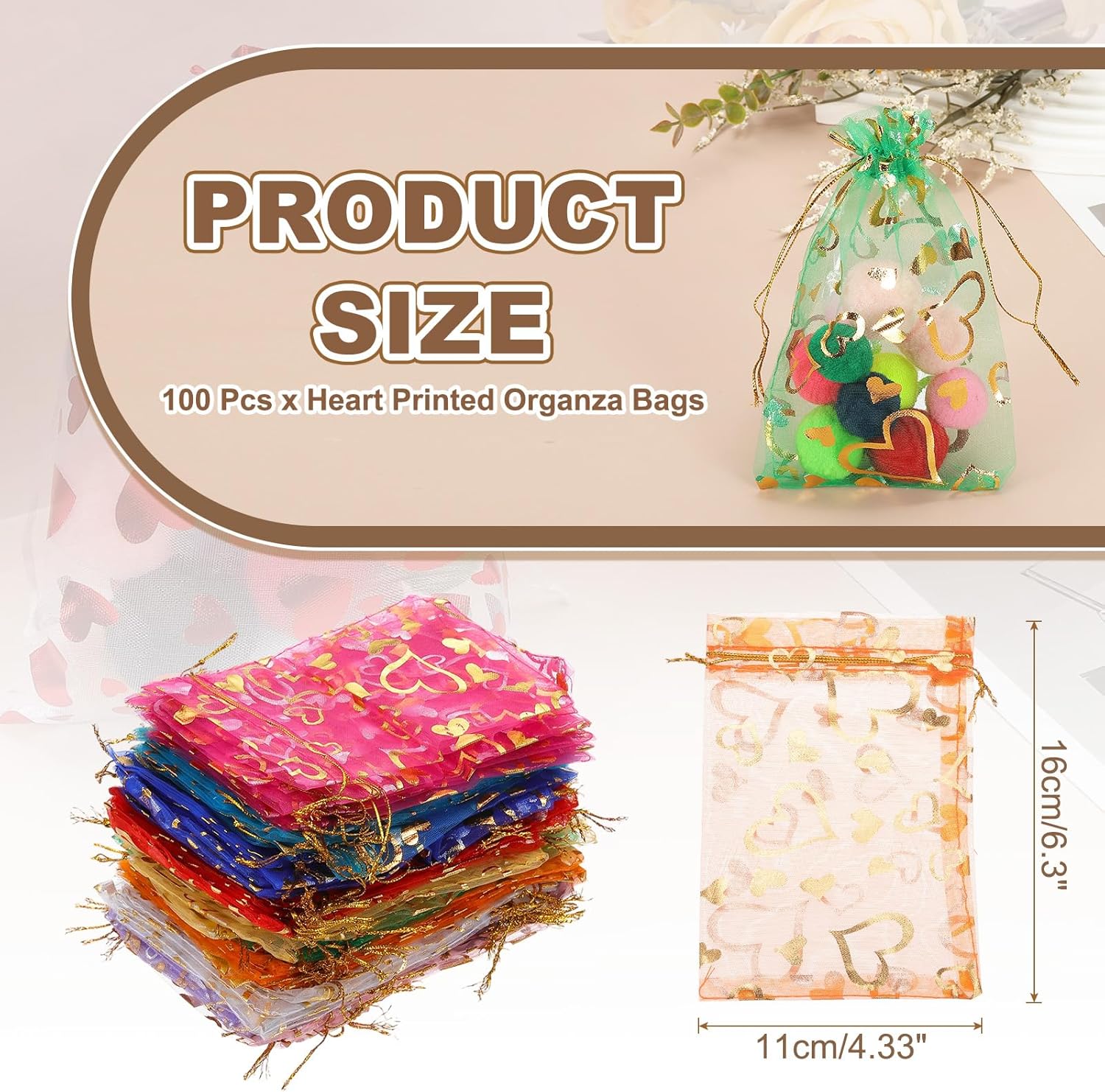 - Color: Gold/Red/Navy Blue/Lake Blue/Rose Red/Pink/Purple/White/Orange/Green; Material: Polyester; Size: 16x11 cm/6.3x4.33 Inch(L*W); Packing List: 100 Pcs x Heart Printed Organza Bags (NOTE: Please confirm the size before choosing our product)