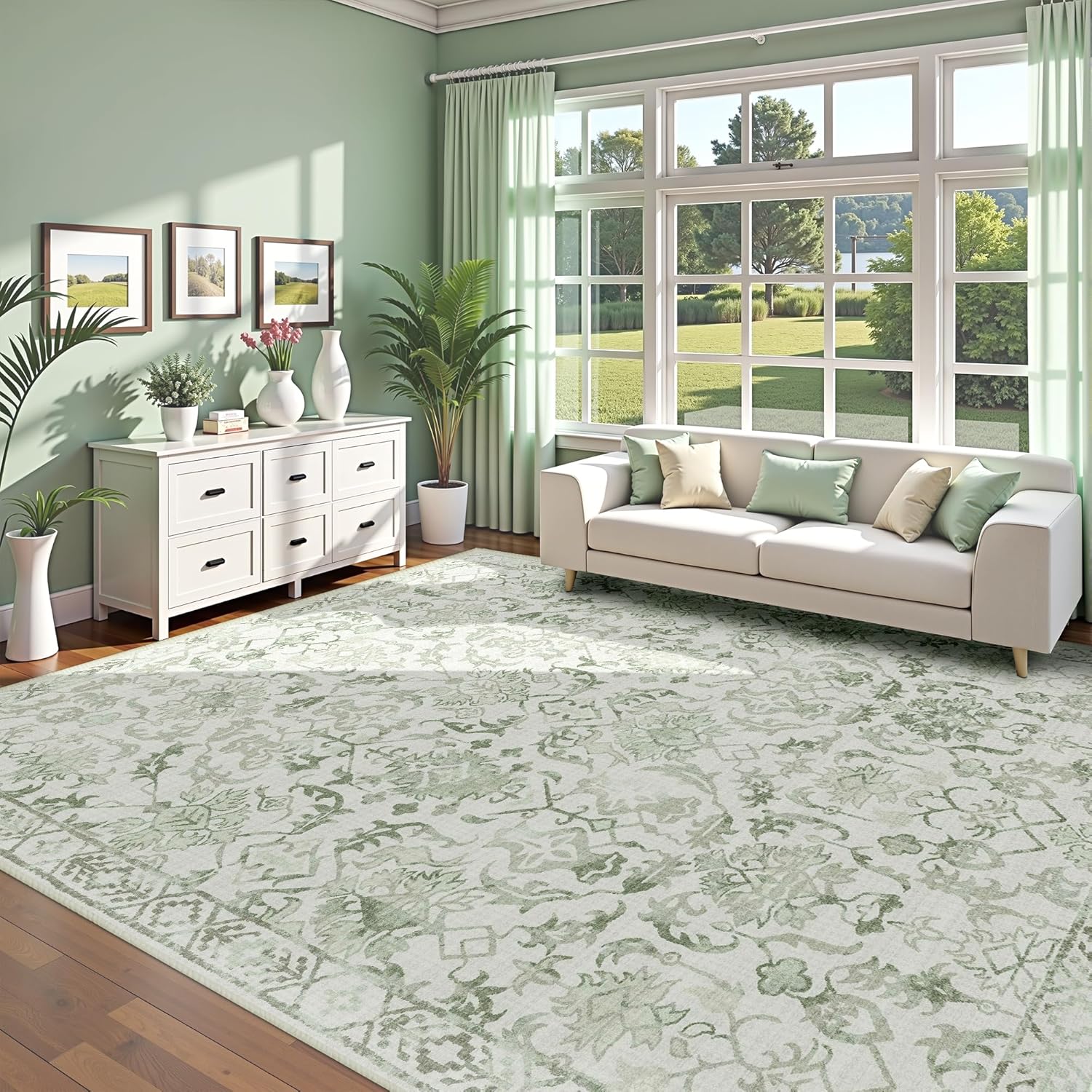 Sage Area Rugs 6x8 for Living Room, Washable Vintage Rugs for Bedroom, Distressed Throw Rug, Non Slip Floral Carpet Green Area Rug for Bedroom Dining Nursery