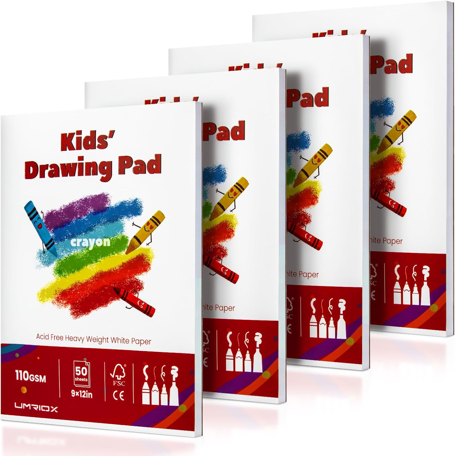 Umriox Drawing Pad for Kids, 9" x 12" Sketch Book, 4-Pack Sketch Pad (50 Sheets Each), 110gsm Acid-Free Drawing Paper, Glue-Bound Art Sketchbook for Kids' Classroom, Travel & School Art Supplies