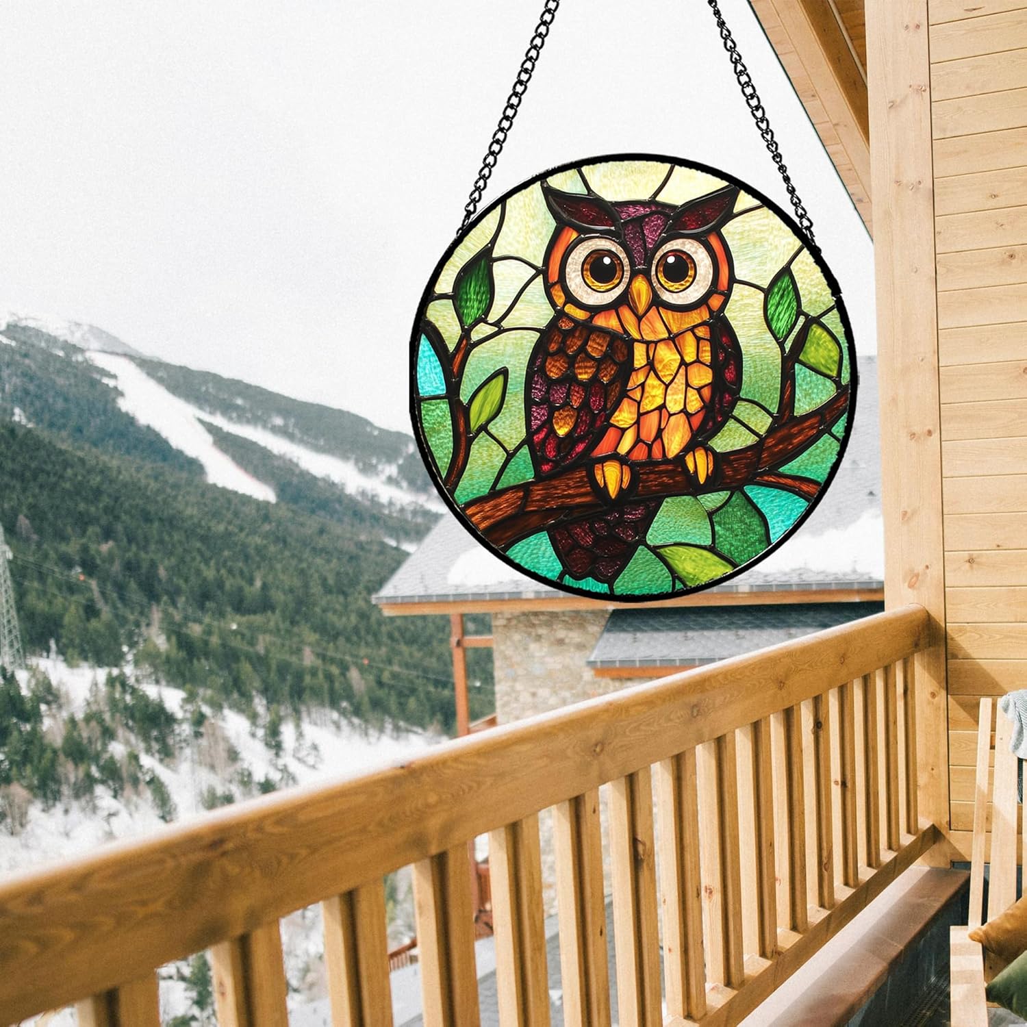 Stained Glass Window Hanging - Owl on a Branch Suncatcher for Doors Window Home Orange Brown Sun Catchers Decor Christmas Mother's Day Birthday Gifts for Teacher Women Men Mom Nana 11.8 in