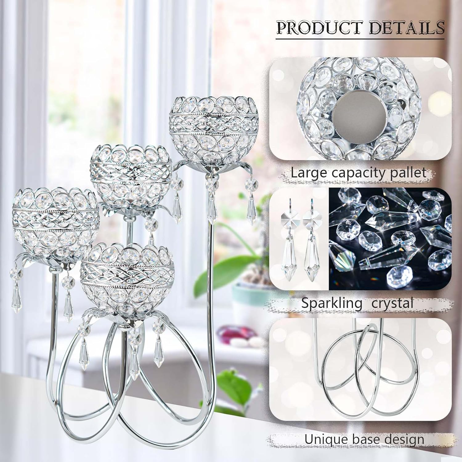 - Dazzling Crystal Bowls & Pendants:Each arm holds a 3.9-inch (10cm) wide crystal bowl with a 1.8-inch (4.5cm) inner tray, designed to securely fit standard tealights while shimmering glass pendants refract light into radiant patterns across your room.