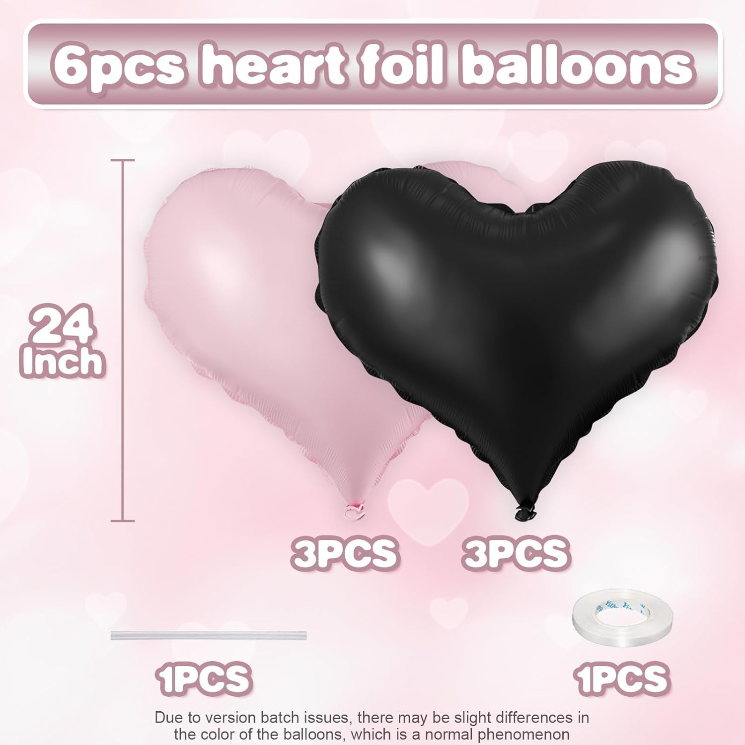 • Package: This set includes 6pcs of 24inch heart foil balloons(black*3,pink*3),1 ribbon,and 1 straw.The generous size makes these balloons perfect for transforming any space into a festive celebration venue, whether you're decorating for a wedding arch, photo backdrop, or party centerpiece.