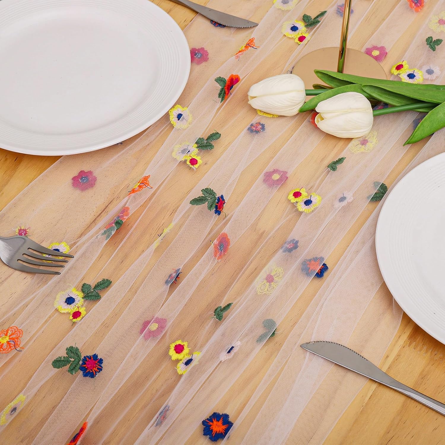 BINBE 6pcs Ivory Daisy Fall Table Runner Embroidery Gauze 10FT Florals Seasonal Tulle Holiday Birthday Kitchen Dining Table Decor for Home Party