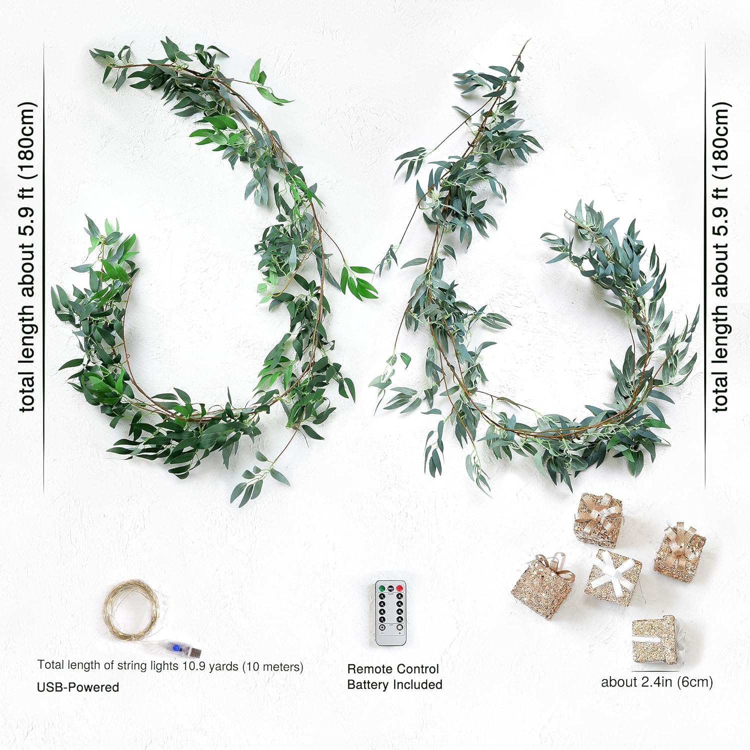- 2-Pack Willow Leaf Garlands with Lights – Each 5.9 ft garland features lush silk greenery on a flexible wire core, easy to bend, drape, or wrap around mantels, arches, stair rails, and tables.