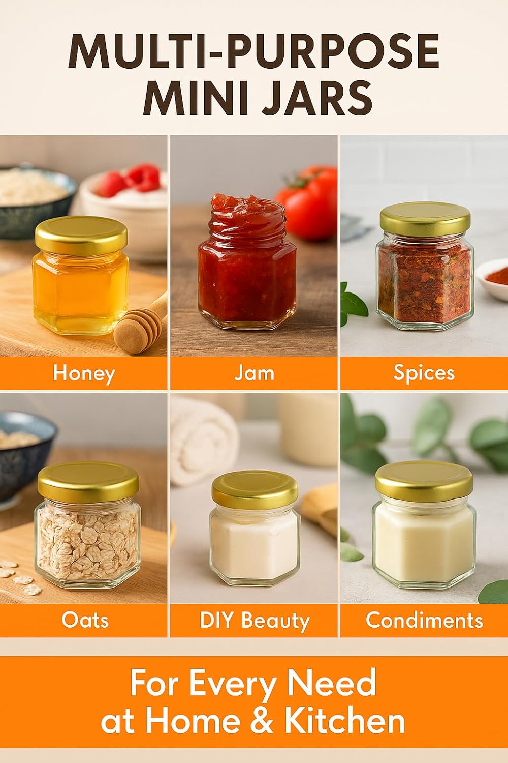 - ✅ Classic & Compact Glass Design Each jar holds 1.5oz and features a hexagon shape for a charming, vintage look. The compact size is ideal for honey, jam, spices, small desserts, and decorative craft items.