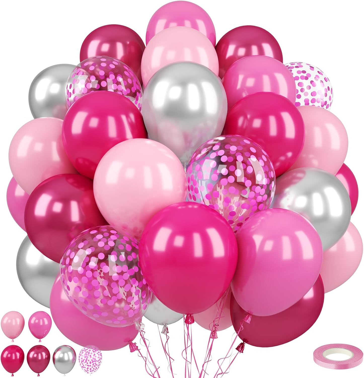 Paready Pink Balloons Set, 50PCS Hot Pink Latex Balloons, 12 Inch Confetti Balloon Metallic Silver Party Balloon Helium for Girls Women Baby Shower Princess Wedding Birthday Party Decorations