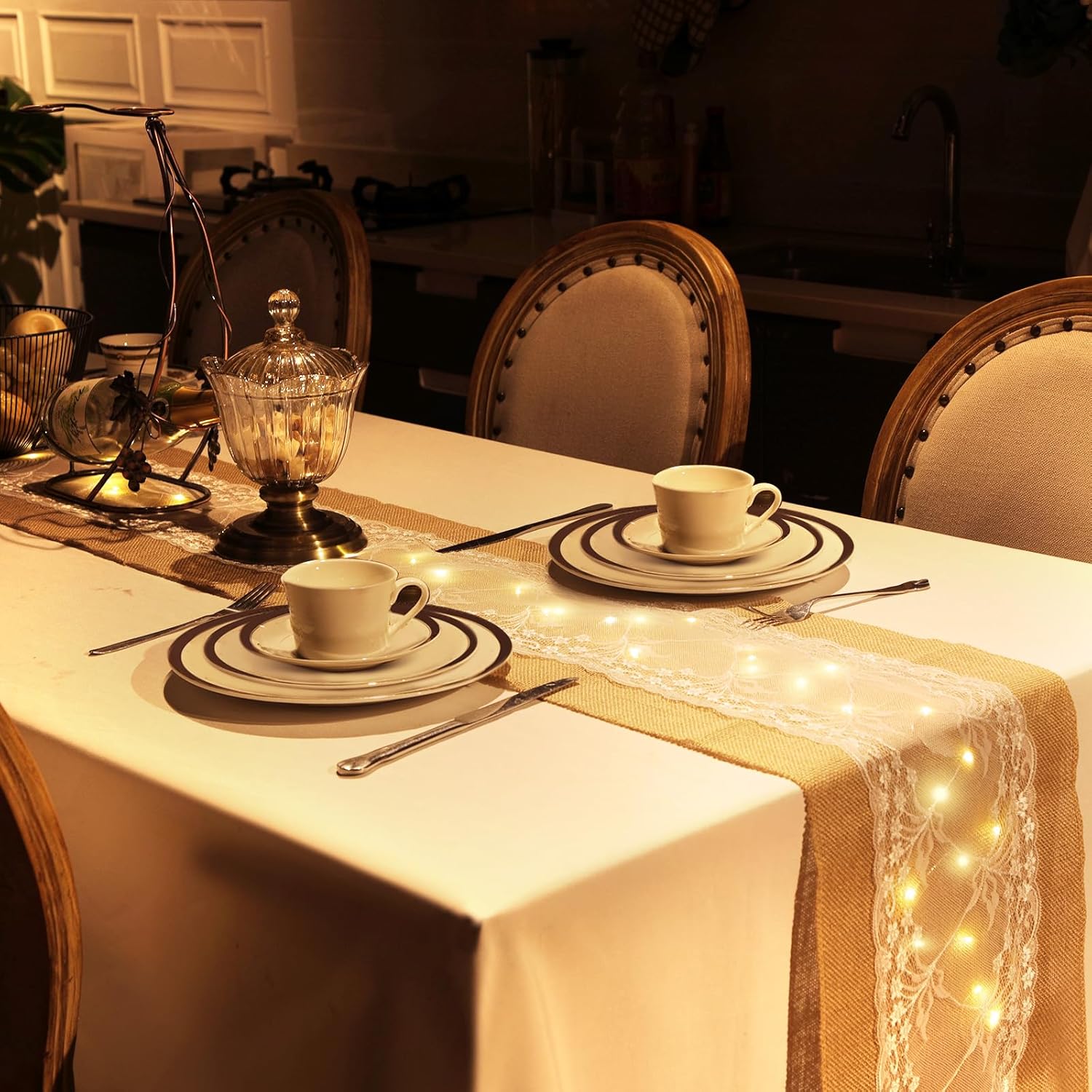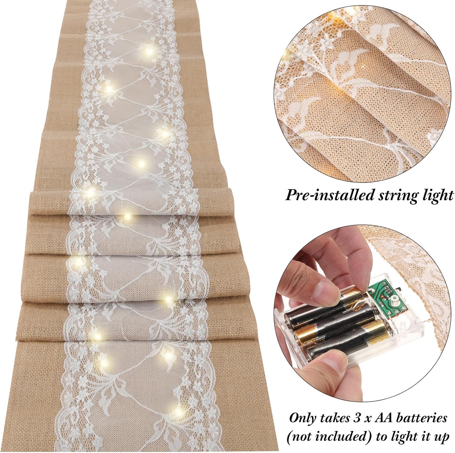 - Light-Up Rustic Elegance: Each burlap table runner features 40 hidden LED bulbs woven under lace, adding a warm glow to weddings, holiday dinners, or evening parties, creating a romantic and festive dining atmosphere
