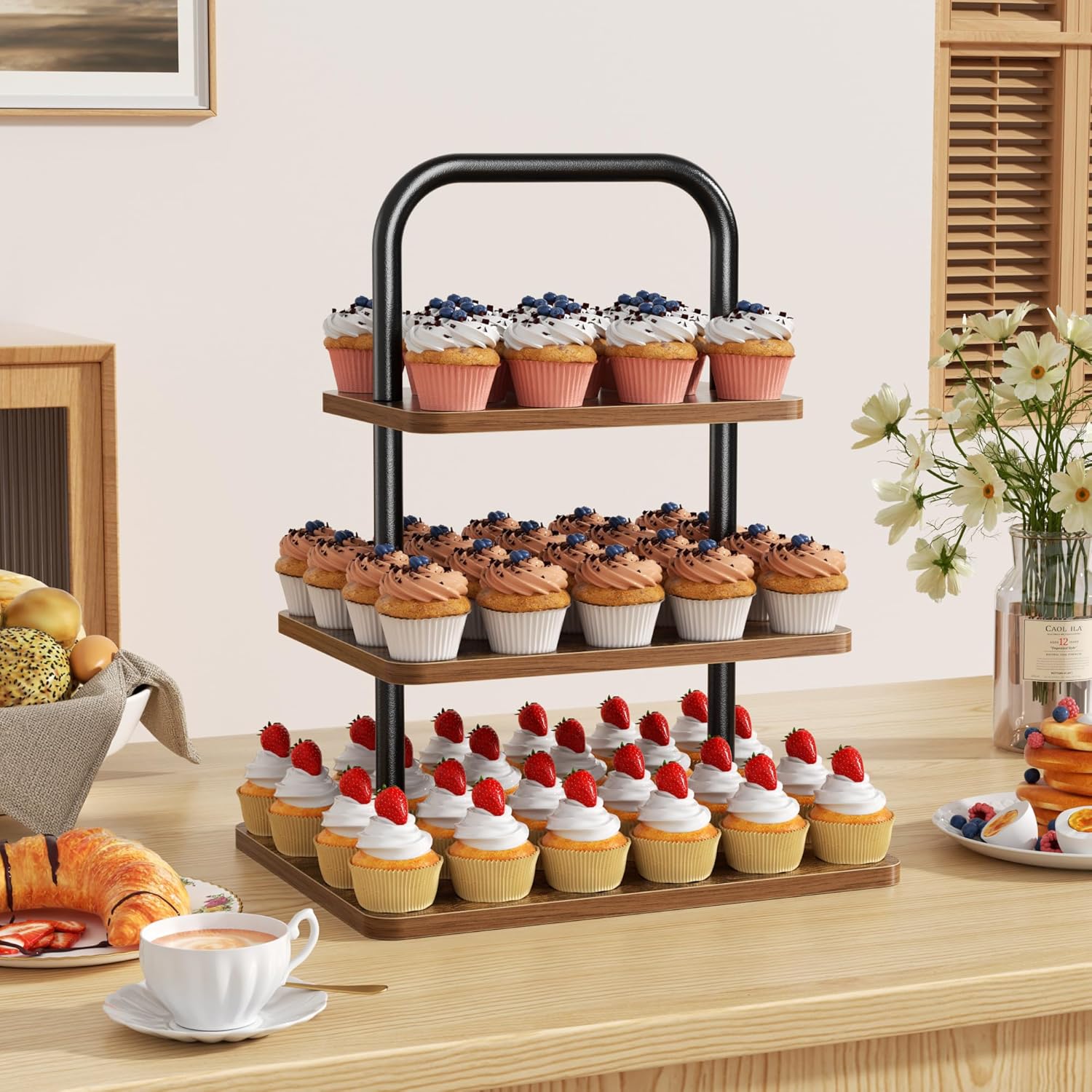 - 【Super-Sized Cupcake Stand for 50+ Treats 】Aminigram wooden cupcake stand comfortably holds up to 50 standard 2" cupcakes, donuts, or mini pastries. Its long rectangular tiers (14.9"x11.8" ) provide more usable space than traditional round stands—perfect for birthday parties, weddings, vendor events, or holiday dessert bars. With generous 5.7" spacing between each level, guests can serve themselves easily without disturbing the display
