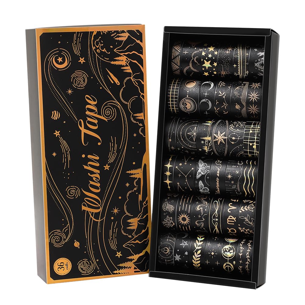 36 Rolls Glow-in-The-Dark Starry Washi Tape Set with Gold Foil Celestial Patterns - Writeable Decorative Tapes for Scrapbooking, Bible Journaling, Bullet Journals 0.6" x 79" per Roll