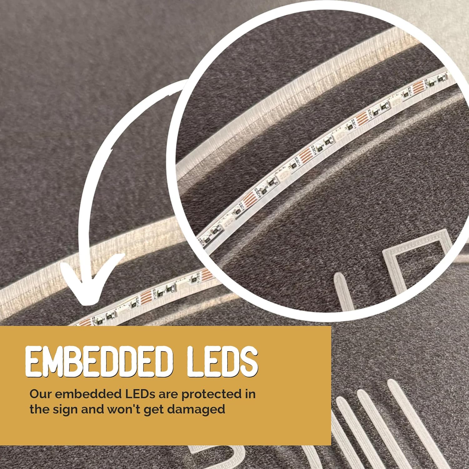 - Custom Acrylic Sign with LED Lights: Personalize this clear laser engraved acrylic sign with a name or phrase and enjoy vibrant color changing LEDs that match your backyard bar, patio, or man cave vibe; comes with a remote for easy control of colors and lighting modes