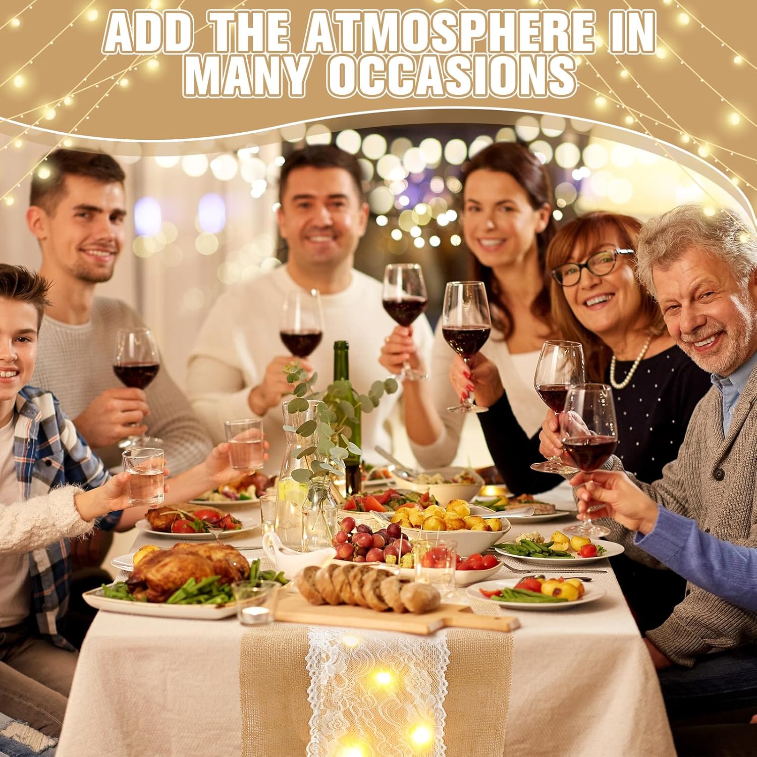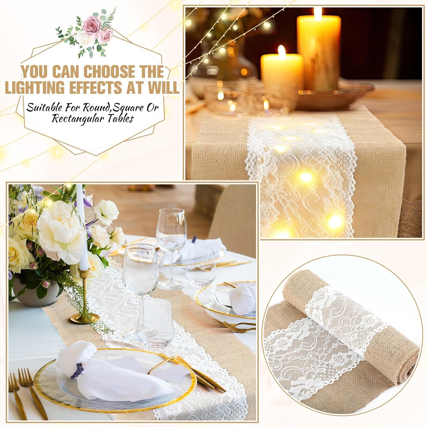 - Light-Up Rustic Elegance: Each burlap table runner features 40 hidden LED bulbs woven under lace, adding a warm glow to weddings, holiday dinners, or evening parties, creating a romantic and festive dining atmosphere