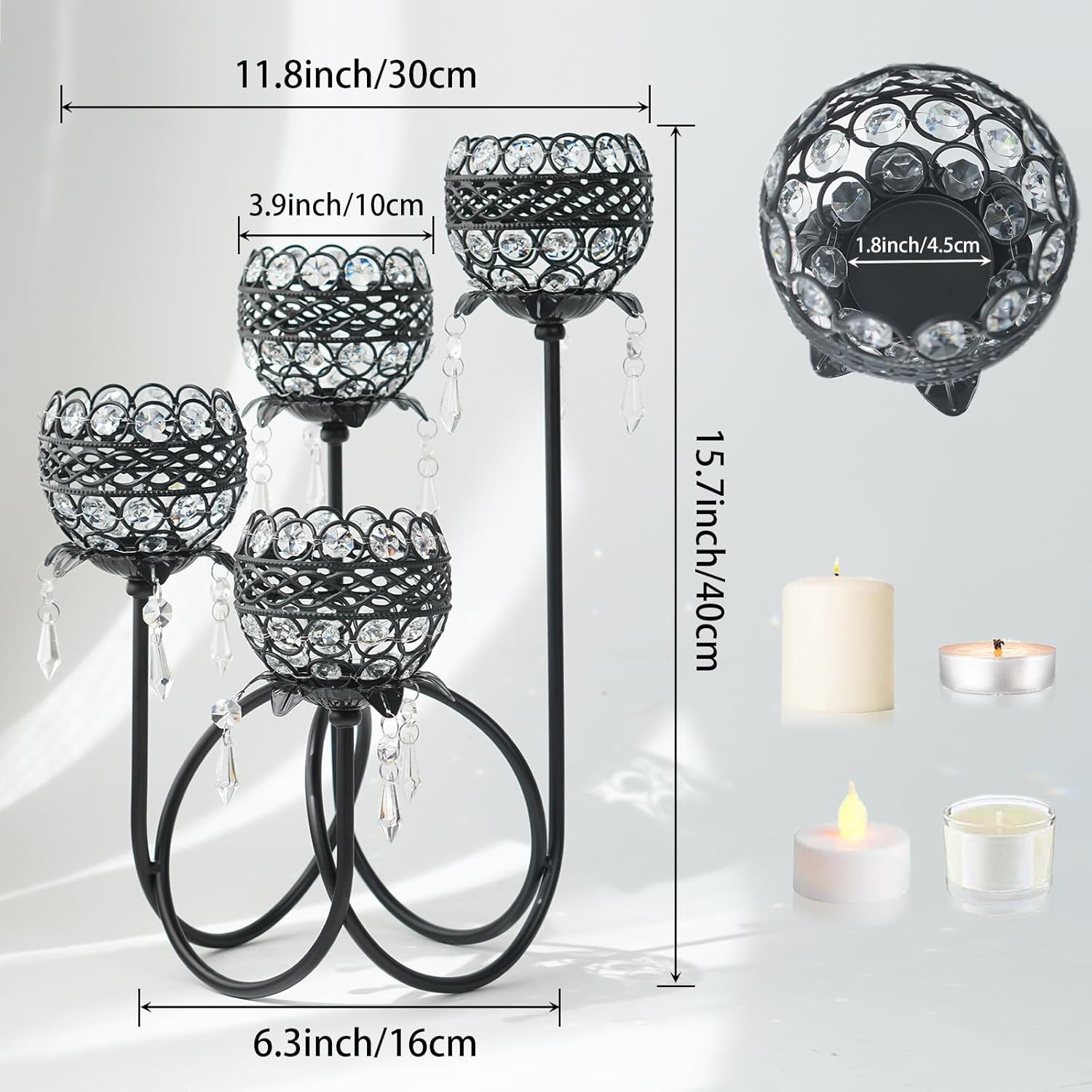 4 Arms Crystal Candelabra Tealight Holder - Tall 15.7 Inch Elegant Centerpiece with Crystal Pendant Bowls & Artistic Metal Stand for Wedding, Dining Table, Home Decor (1, Black)