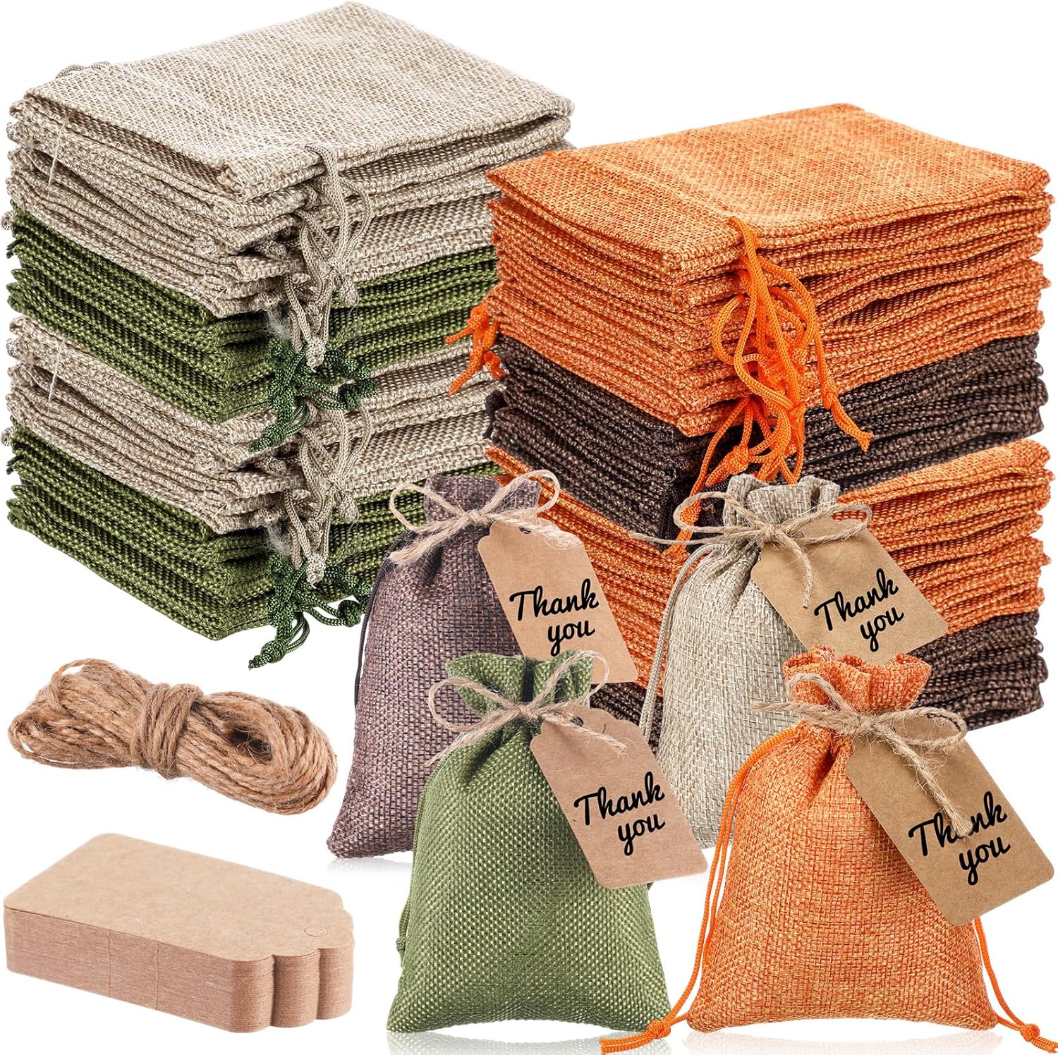 Woanger 100 Pcs Burlap Gift Bags with 100 Pcs Kraft Paper Gift Tags Drawstring Favor Bulk Burlap Sack Bags for DIY Wedding Party Craft(4 x 6 Inch,Natural Color, Dark Brown, Military Green, Orange)
