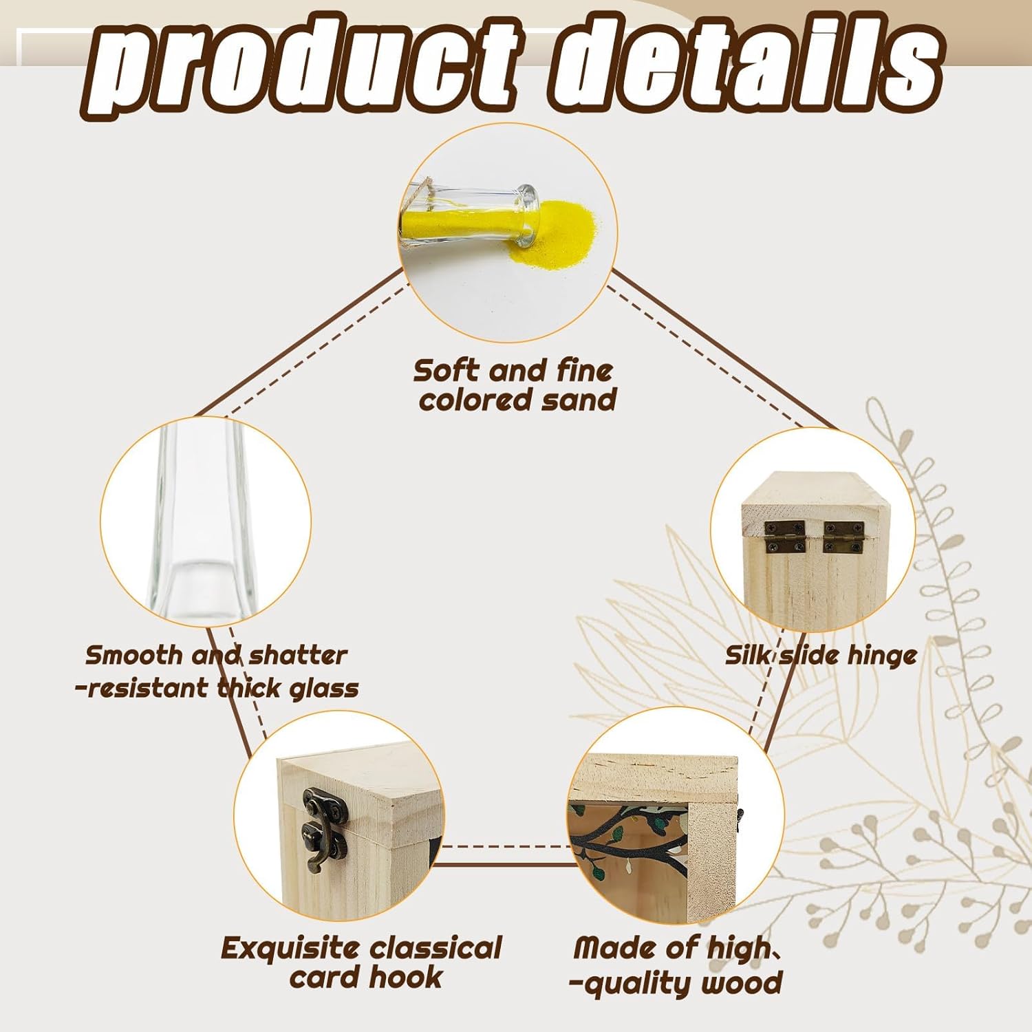 - 【Excellent Quality】Our sand ceremony set box is made of high-quality solid wood, hand-polished and processed to a smooth surface that is not easily damaged; the glass vases are made of transparent high-hardness glass with smooth and beautiful lines that are not easily broken; the colored sand is even in texture, has high flowability, and has beautiful and elegant colors, making your wedding ceremony noteworthy.