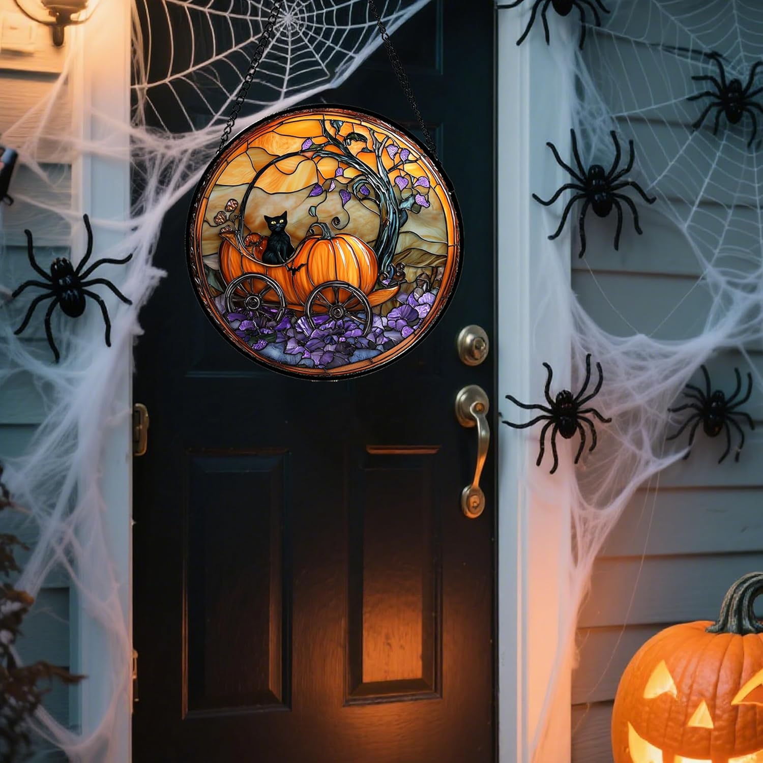 Stained Glass Window Hanging - Halloween Pumpkin Carriage Black Cat Suncatcher for Doors Window Garden Spooky Sun Catchers Gothic Decor Horror Gifts for Women Men Friend Boy Girl 7.8 in