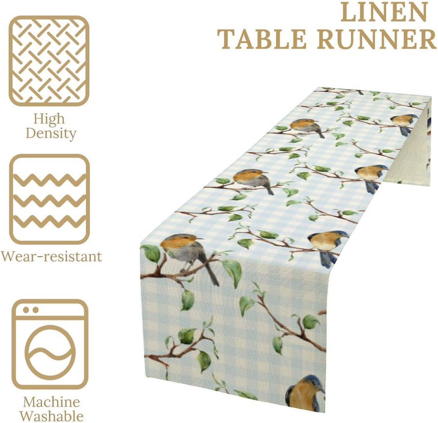 Bird Table Runner,Spring Birds Tree Blue Plaid Print Table Runner for Kitchen Dining Table Decoration Home Party Decor 13x108 Inch