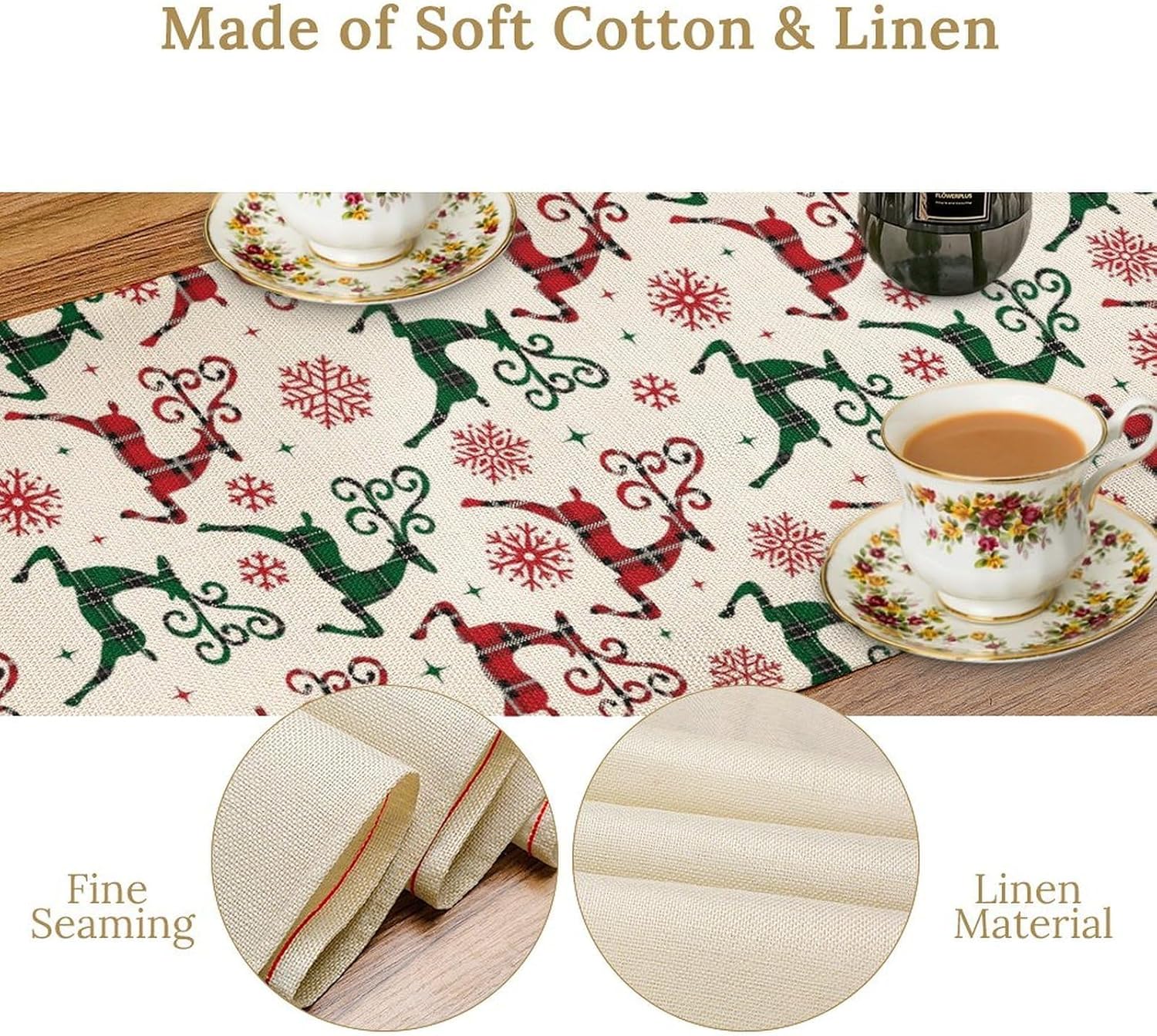 Christmas Table Runner,Christmas Plaid Deer Print Farmhouse Table Cloth Kitchen Dining Table Decoration for Home Party Decor 13x120 Inch