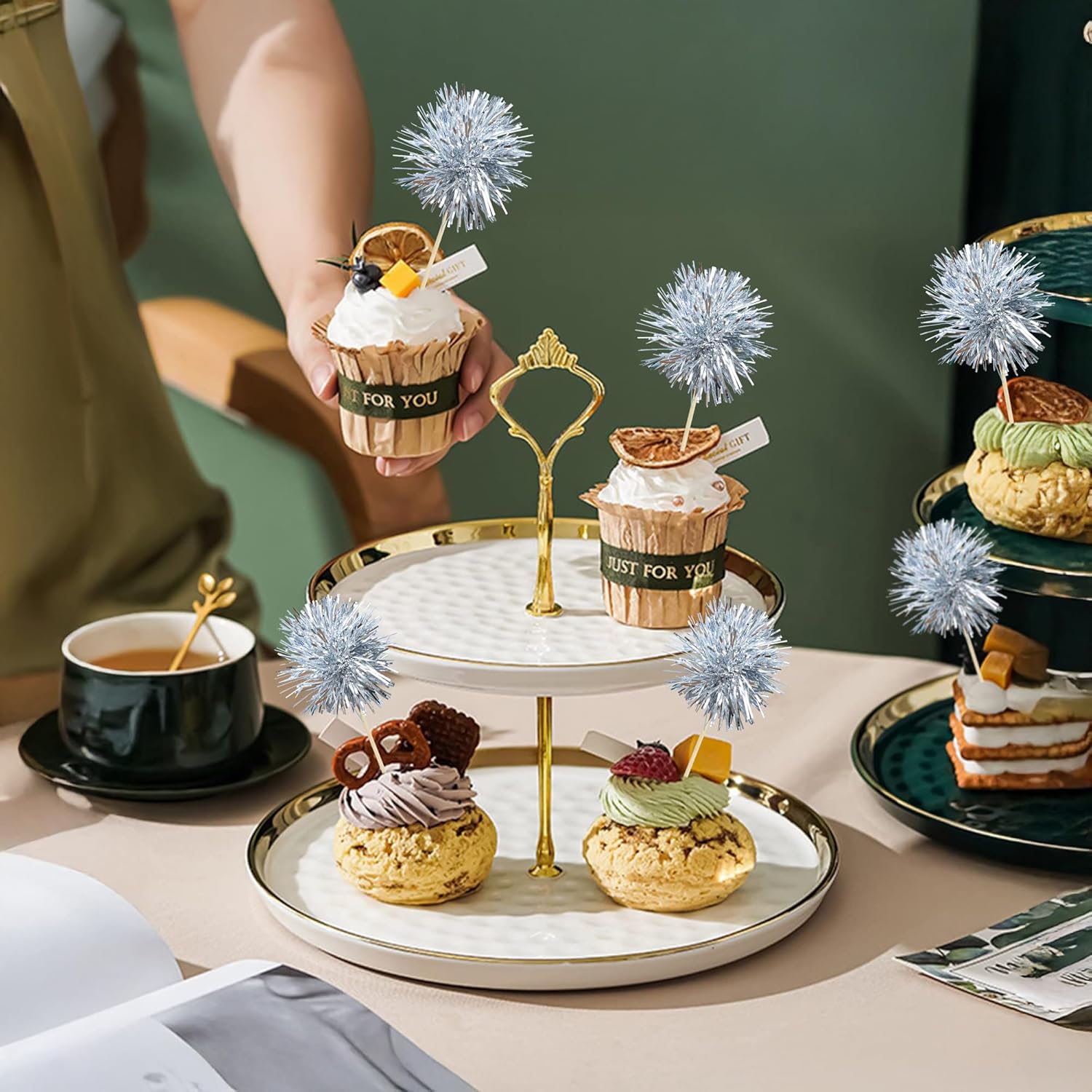 Ephlyn 30Pcs Foil Firework Cupcake Toppers Sparkle Tinsel Cupcake Picks Happy Birthday Cake Toppers Drink Stirrers Cocktail Food Fruit Toothpicks for Baby Shower Birthday Party Supplies Silver