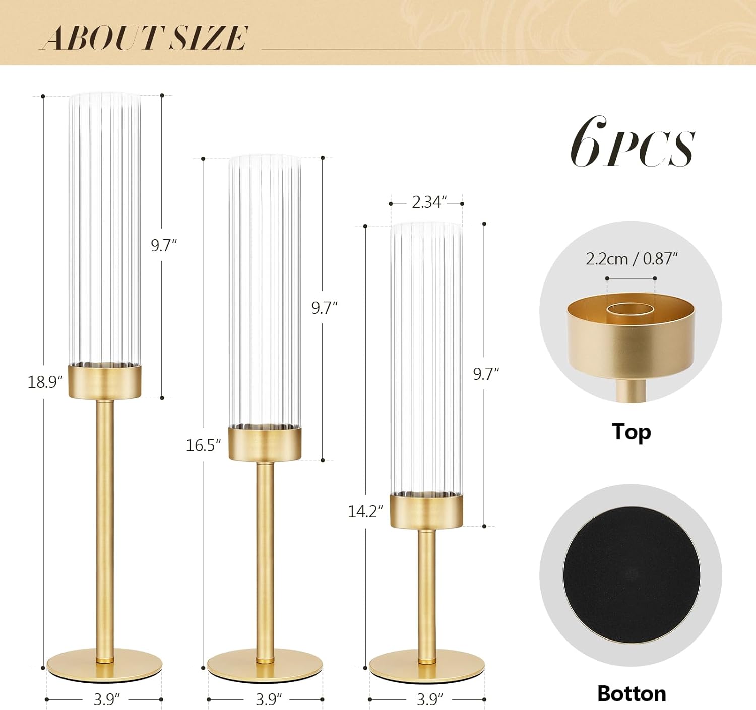 - FIT FOR 7/8 STANDARD SIZED TAPER CANDLES - Ideal Size for Decor: Set of tapered candlestick holders in 3 assorted heights: 14inches/36cm, 17nches/42cm, 19 inches/48cm (with hurricane height). The candle hole diameter measures 0.86inches/2.2cm, fits 7/8"fits standard tapered candles/ candle sticks/ flameless candles/ candlesticks!
