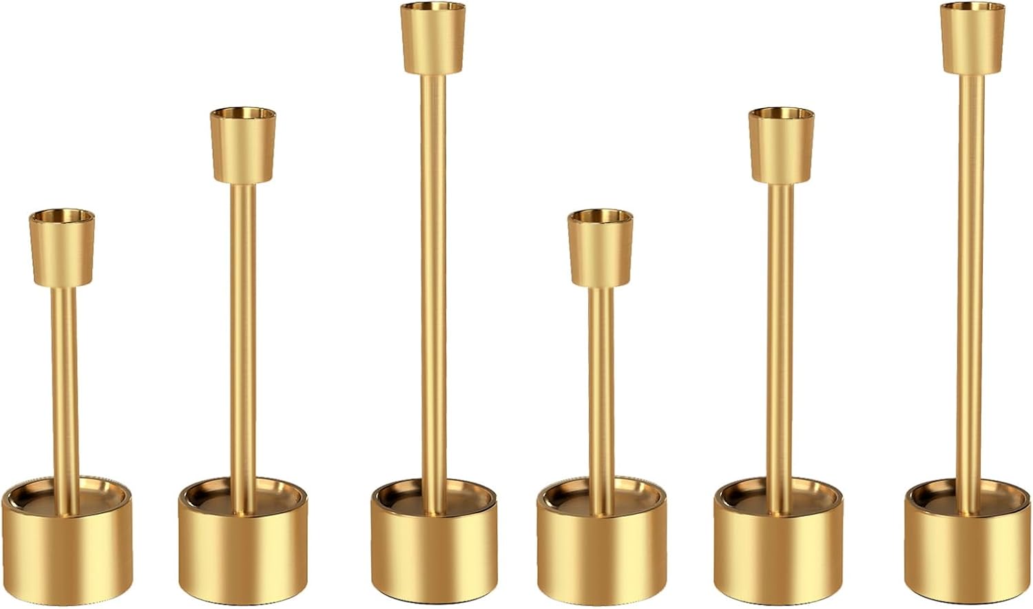 - VERSATILE HOME DECOR SET: 3-tiered heights (6", 7.5", 9.5") create visual layering for dining table centerpieces, holiday decor, or wedding candle displays. The luxurious brushed gold finish instantly elevates any space