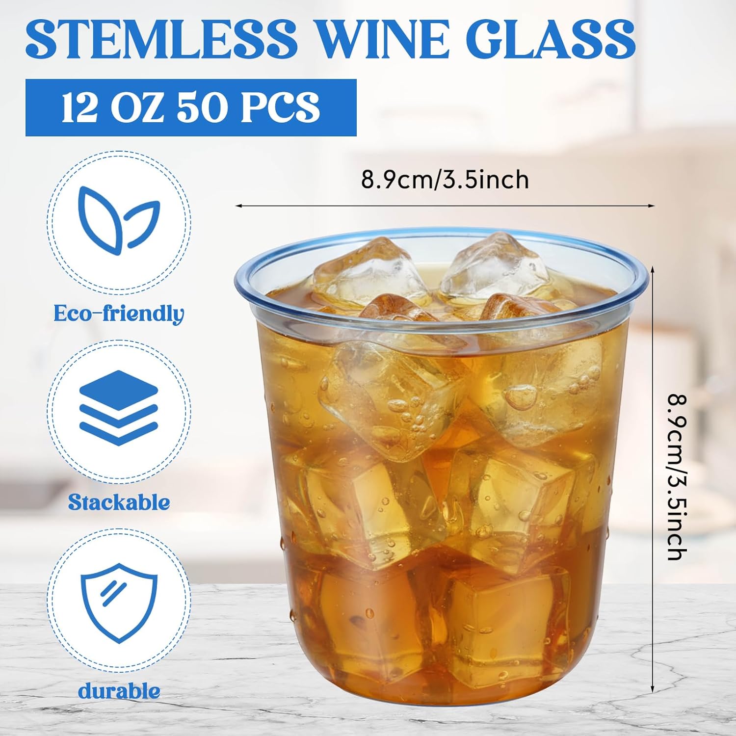 50 Pcs Disposable Stemless Glasses 12oz Crystal Plastic Wine Glasses Clear Classic Pet Cup for Meeting Weddings Birthdays Cocktail Christmas Party Supplies (Light Blue)